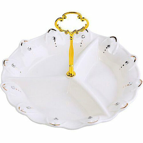 Менажница фарфоровая LORAINE, сочетает в себе изысканный дизайн с максимальной функциональностью. Блюдо по краям оформлено элегантным декором с золотистой каймой, ажурными элементами и стразами. Менажница имеет 3 секции, а также удобную металлическую ручку. Такое сервировочное блюдо предназначено для красивой подачи конфет, фруктов и десертов, а также можно использовать для сервировки оливок, сыра, закусок. Менажница украсит сервировку вашего стола и подчеркнет прекрасный вкус хозяйки. Менажницы являются отличным вариантом подарка для любой женщины: мамы, бабушки, подруги. Этот функциональный предмет посуды прост в обращении, легко моется, не занимает много места. Менажница LR (х12). Материал: фарфор. Цвет: белый, золототой. Секций: 3 шт. Высота тарелки: 3,5 см, с ручкой - 15 см. Диаметр: 22 см. Размер секций: 10 х 10 х 18 см. Объек секции: 150 мл. Размер упаковки: 22,8 х 22,8 х 5 см. Упаковка: коробка. Вес: 672 гр. Страна производитель: Китай.