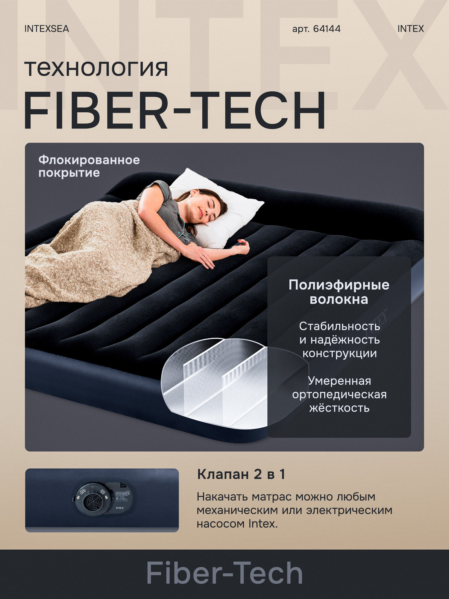 Матрас кемпинговый 183х203х25 см (64144) INTEX Надувной матрас Интекс Pillow Rest Classic - сочетание стильного дизайна и восхитительного удобства! Благодаря запатентованной технологии Fiber-Tech, перегородки внутренней конструкции, состоящие из тысяч высокопрочных полиэфирных волокон, не деформируются со временем. Этот надувной домашний матрас подстраивается под ваши предпочтения по жесткости, великолепно поддерживает тело и обеспечивает комфортный сон.
