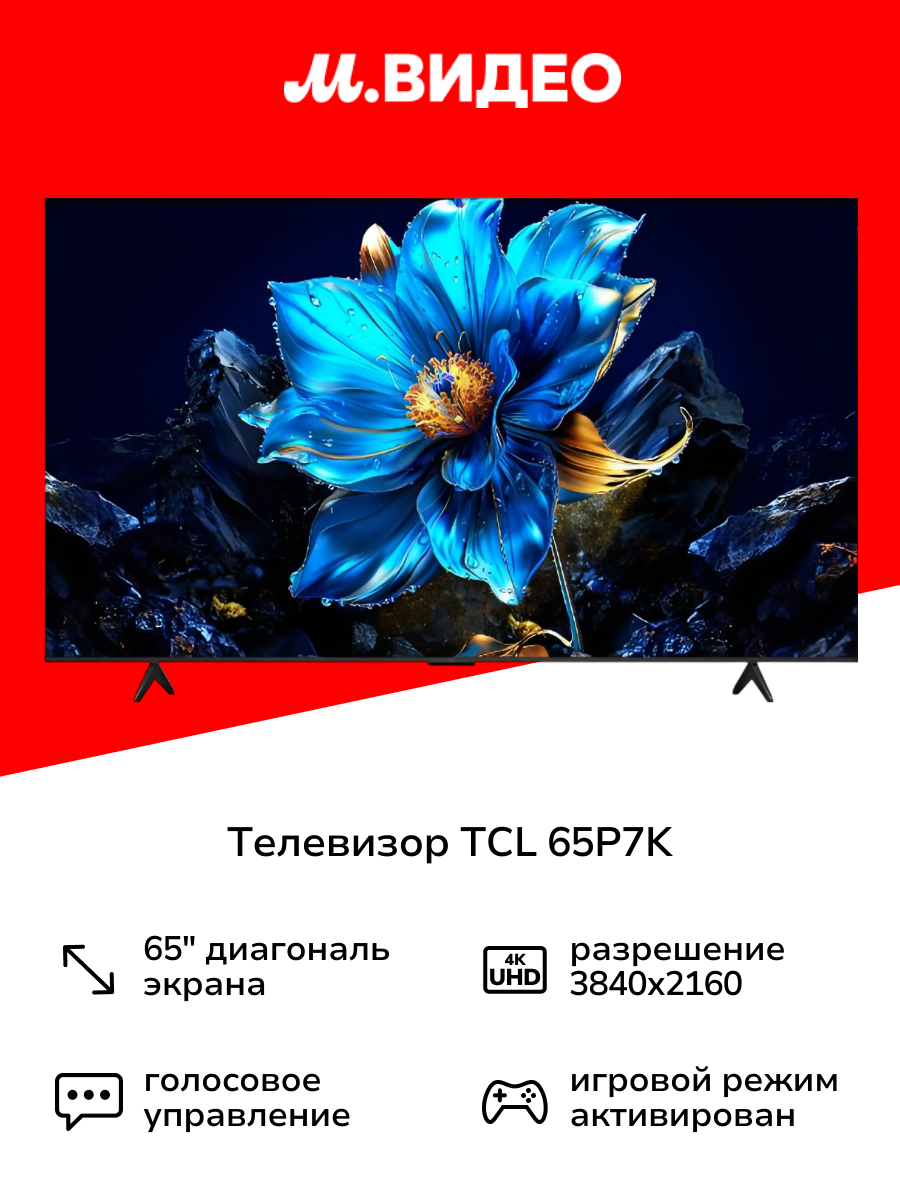 Телевизор TCL 65P7K, 65″, QLED, 4K Ultra HD, Google TV, черный: сравнение цен, характеристики, фото, актуальное наличие и цены.