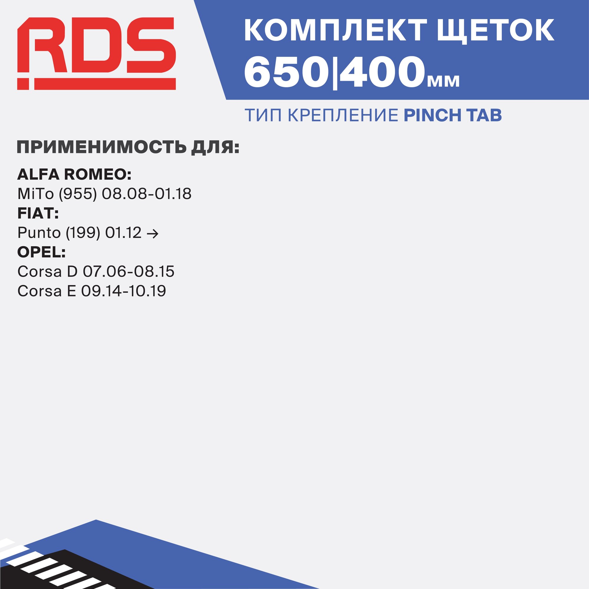 Купить 650 400 мм. Крепление Pinch tab. Комплект бескаркасных щеток стеклоочистителя RD5 дворники на Alfa Romeo MiTo; Альфа Ромео МиТо; Fiat Punto; Фиат Пунто; Opel Corsa D; Опель Корса Д; Opel Corsa E; Опель Корса Е с доставкой по всей России.