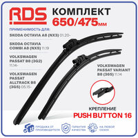 650 475 мм. Крепление Push Button 16. Комплект бескаркасных щеток стеклоочистителя RD5 дворники на Skoda Octavia A8, Volkswagen Passat B8, Фольксваген Пассат, Шкода Октавия: сравнение цен, характеристики, фото, актуальное наличие и цены.