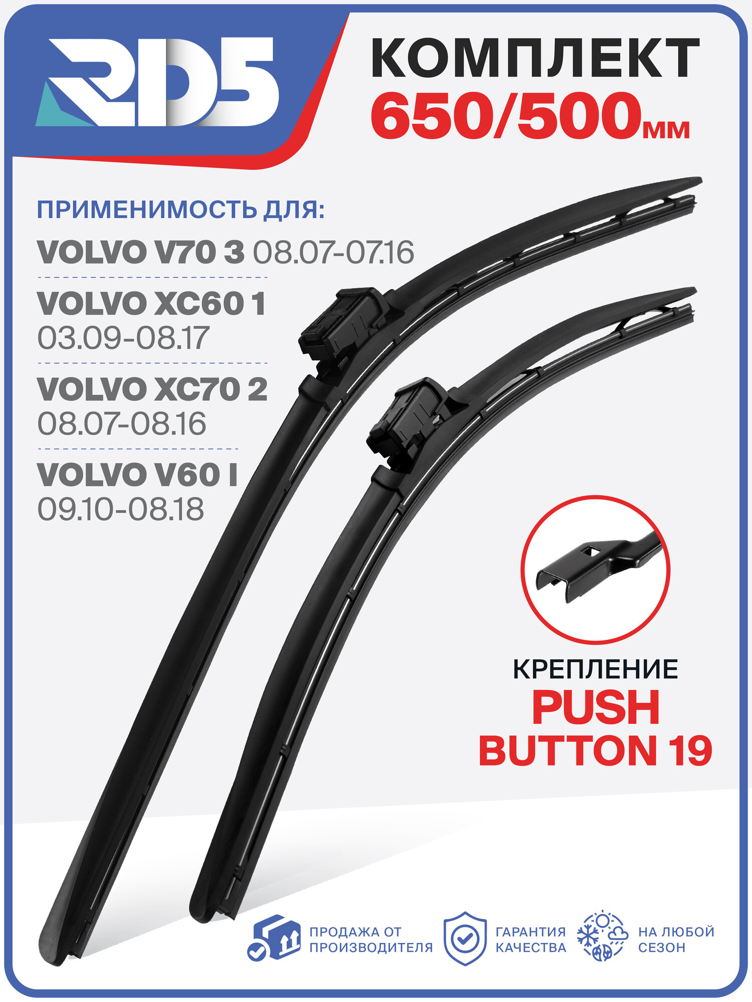 650 500мм. Крепление Pushbutton 19. Комплект бескаркасных щеток стеклоочистителя RD5 дворники на Volvo V70 III; Вольво В70 3; XC60 I; ИксЦ60 1; XC70 II; ИксЦ70 2; V60 I; В60 1: сравнение цен, характеристики, фото, актуальное наличие и цены.