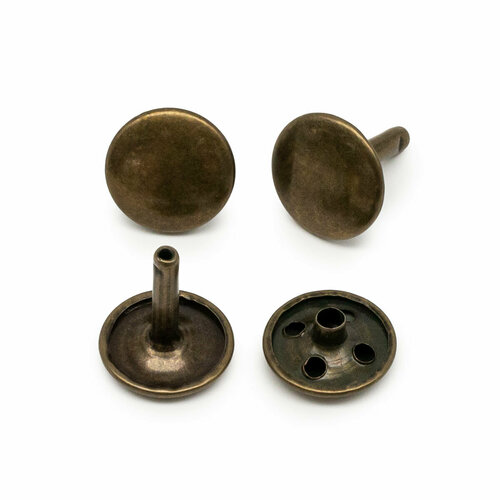 Металлические хольнитены используются, чтобы укрепить швы сумках. Позволяют соединять детали в труднодоступных местах и закрепить мелкие элементы. Эти заклепки состоят из двух частей: шляпки и ножки. После установки выглядят одинаково и с лицевой, и с изнаночной стороны. Чтобы правильно выбрать длину ножки, нужно знать толщину предполагаемого шва. Хольнитены изготовлены из металла высокого качества, прочные, не гнутся, сохраняют цвет и не подвержены коррозии, выдерживают все стандартные нагрузки. Для установки данной фурнитуры потребуется специальный пресс и насадка-пуансон. Ответные части заказываются отдельно. Цвет: латунь. Материал: сталь. Размер: d15 мм h16 мм. Страна происхождения: Греция