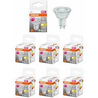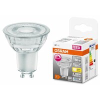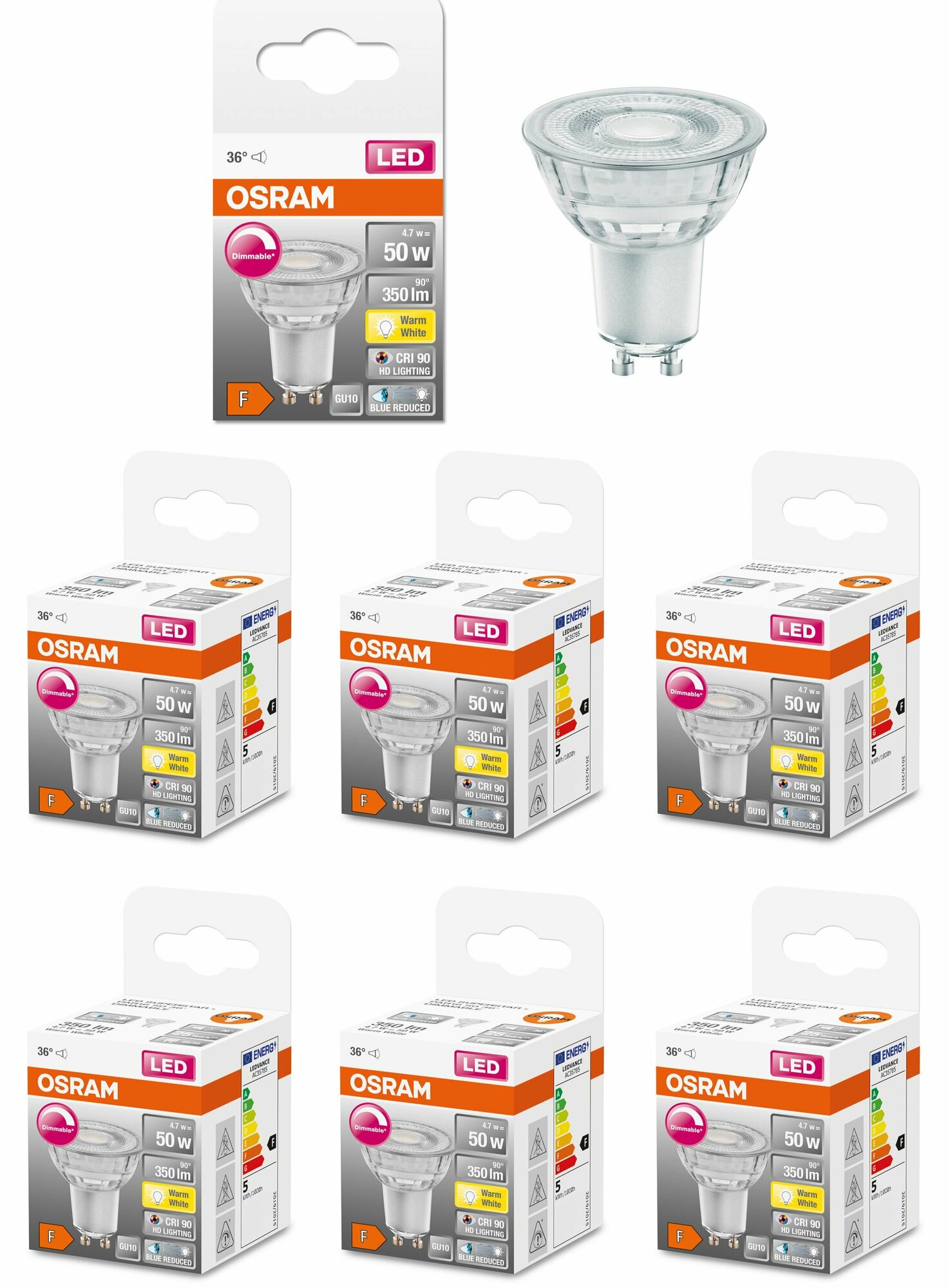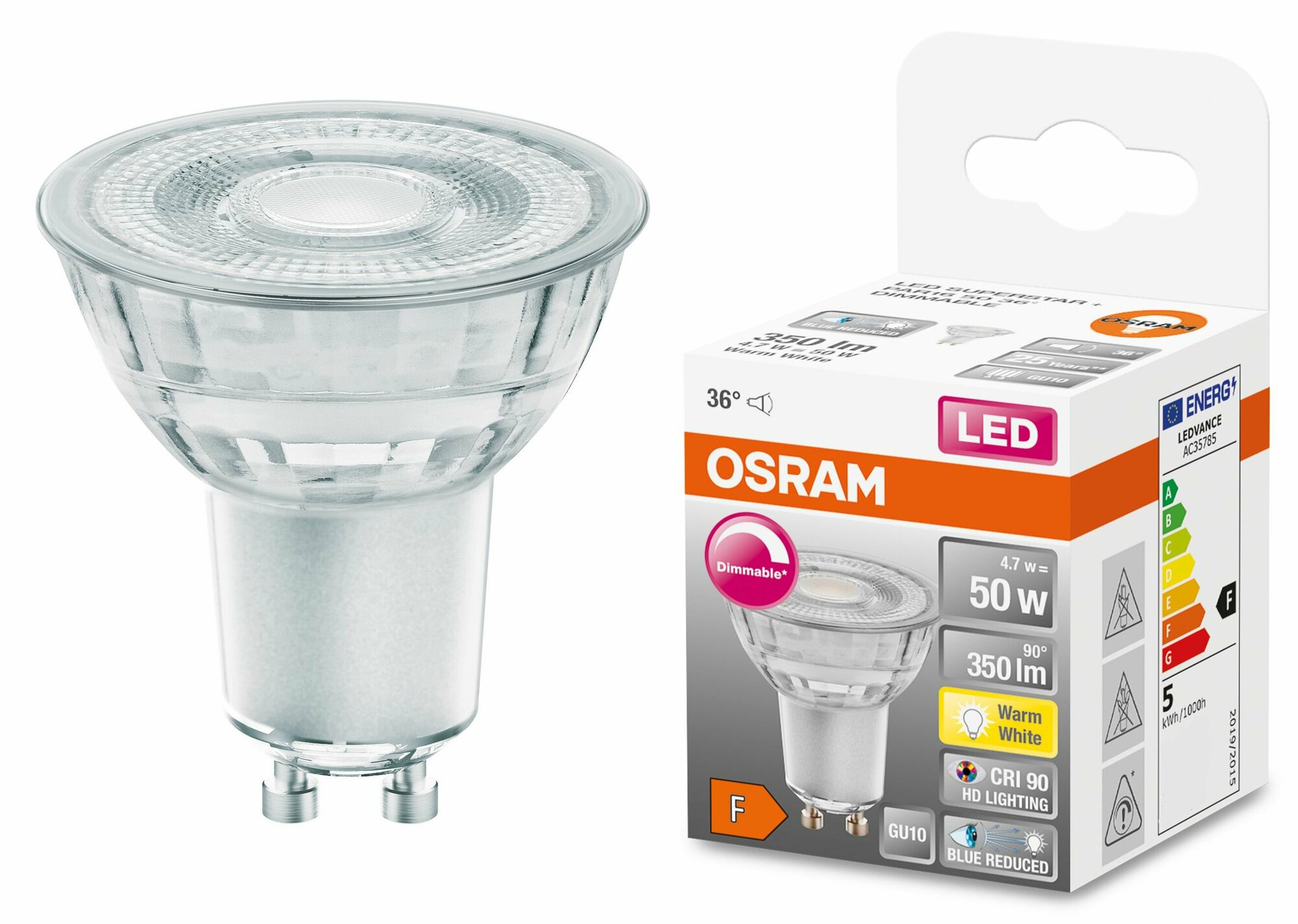 Лампа светодиодная диммируемая OSRAM LED Superstar, 350лм, 4,7Вт (замена 50Вт), 2700К (теплый белый свет). Цоколь GU10, колба PAR16, угол пучка 36°. Исполнение колбы прозрачное, Стекло.