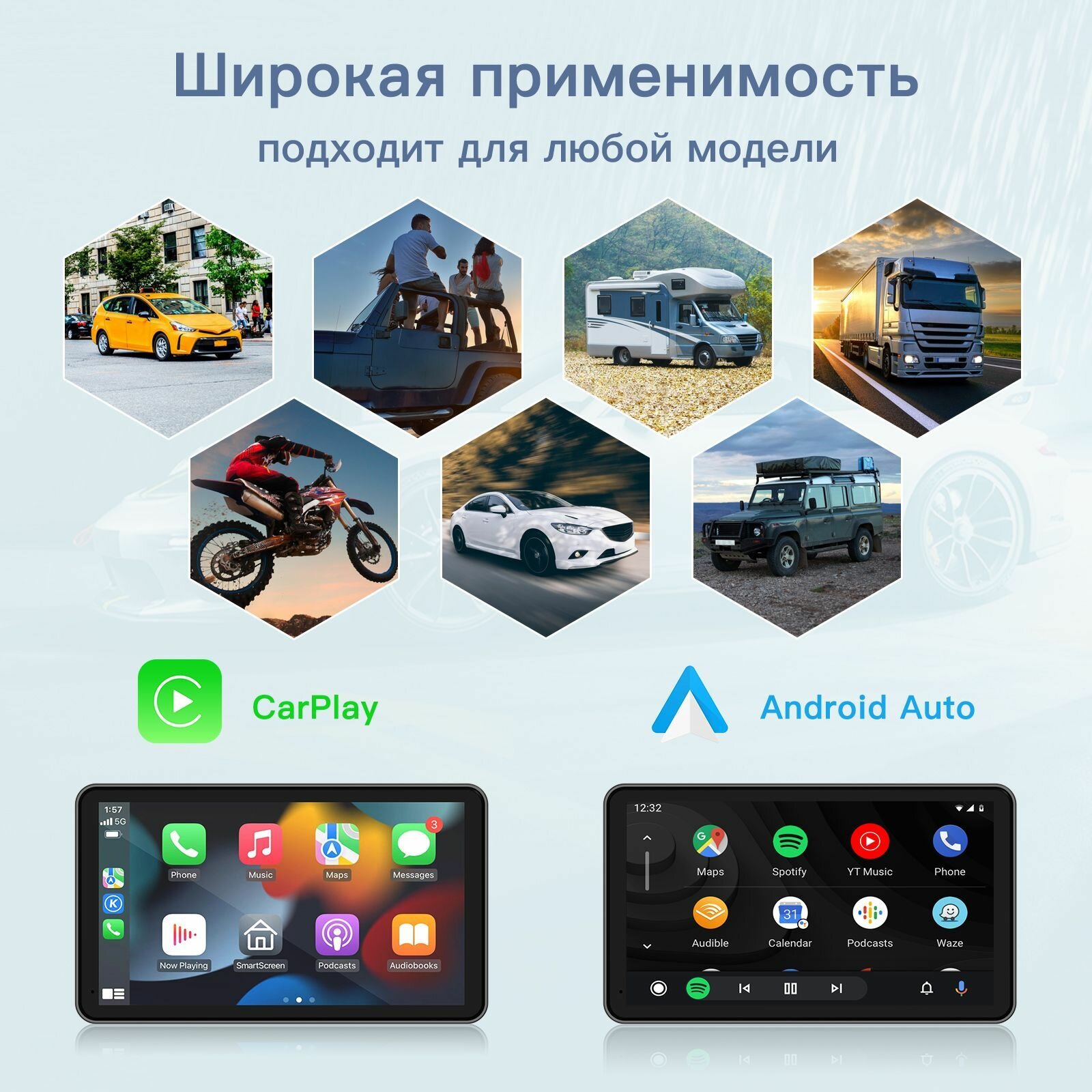 Беспроводное подключение Apple CarPlay и Android Auto. Оцените бесшовное беспроводное соединение с 7-дюймовым экраном Apple CarPlay. Наслаждайтесь удобством беспроводной связи Apple CarPlay и Android Auto, позволяющей легко получать доступ к GPS-навигации, телефонным контактам, электронной почте, уведомлениям, музыке и многому другому, обеспечивая при этом безопасное вождение.