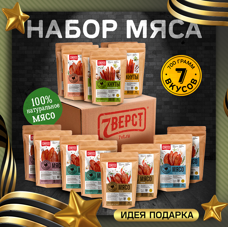 Купить Вяленое мясо 7 Вёрст набор «Ассорти №5» Снеки 700 г с доставкой по всей России. Вяленое мясо 7 Вёрст набор «Ассорти №5» Снеки 700 г: сравнение цен, характеристики, фото, актуальное наличие и цены.
