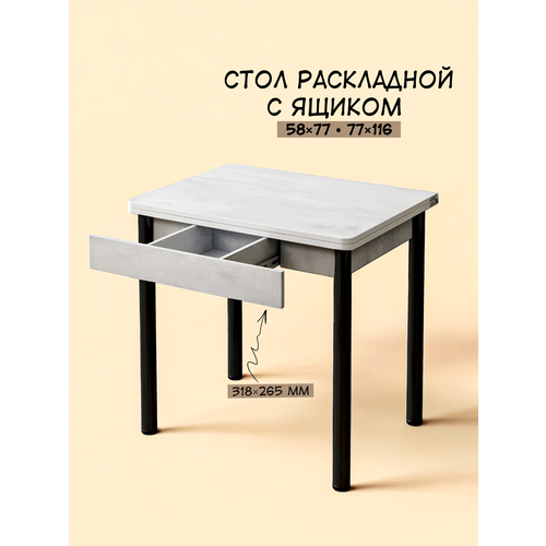 Купить 77х58 (116) см Раскладной кухонный стол с ящиком, для кухни, столовой, дачи и дома, с металлическими ножками, цвет Бетон Пайн Белый с доставкой по всей России.