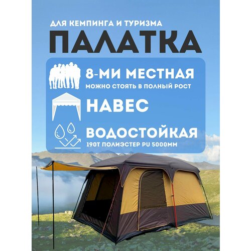 Туристическая палатка шатер походная 8-местная - очень вместительная палатка для отдыха на природе и туризма большой компанией. Благодаря навесу можно проводить время за столом при сильном солнце или незначительных осадков! Фабричное качество пошива и материалов обеспечит вам комфортный отдых на природе в любых погодных условиях! Палатка поставляется в фирменном чехле, что обеспечит удобную транспортировку в сложенном виде! палатка для рыбалки, для кемпинга, шатер туристический, шатер садовый, палатка шатер Желаем Вам приятного отдыха и удачных покупок!