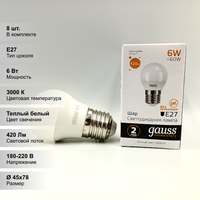 (8 шт.) Светодиодная лампочка Gauss G45 шар, мощность 6 Вт, напряжение питания 180-240 В, цветовая температура 3000 К, теплый белый свет, цоколь E27, размер 45х78 мм, 53216