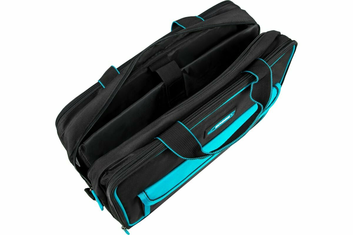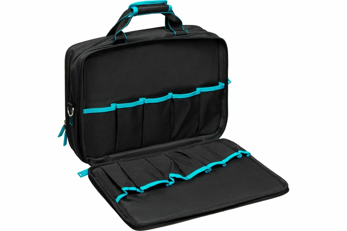 Сумка для инструмента предназначена для переноса и хранения ручного инструмента, документов формата А4, а также ноутбука с диагональю экрана до 15. Множество удобных карманов и прижимных резинок позволяют быстро устанавливать и фиксировать инструменты в сумке. Сумка оснащена удобными рукоятками для переноски, а также наплечным ремнем. Длина сумки 410 мм.