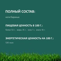 Содержит высушенные бараньи ноги. Гипоаллергенный белок, высокое содержание хрящевой и соединительной ткани. Изделие содержит кожу, много кости, жира, коллагеновой соединительной ткани и лишь прослойки мышечной ткани. Массирует десны и укрепляет жевательную мускулатуру, очищает зубной налет и предотвращает возникновение зубного камня. Прекрасная игрушка, сохраняющая в целости предметы интерьера и личные вещи. Изделие содержит трубчатую кость и не предназначено для полного поедания. Как только собака съела футляр из кожи, сухожилий и мышц – необходимо заменить лакомство на новое.
