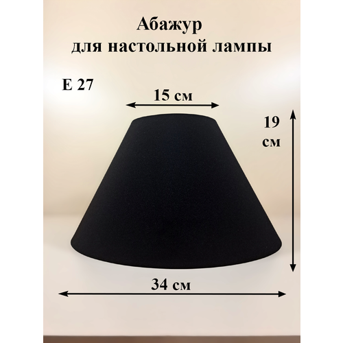 Абажур произведен в России и сочетает в себе качество, стиль и функциональность. Отсутствие узоров делает абажур универсальным дополнением к любому интерьеру. Технические характеристики абажура: - Размер: 34*15*19 см - Цвет товара: чёрный - Материал: металл, текстиль, пластик - Тип светильника: настольный - Вид ламп: светодиодные - Мощность ламп рекомендуемая максимальная : 10 Вт - Степень пылевлагозащиты: IP20 - Количество ламп: 1 - Тип цоколя: E27 - Вес: 150 г - Диаметр плафона/абажура: 34 см - Высота: 19 см - Диаметр нижний: 34см - Диаметр верхний: 15 см Выбирая абажур для настольной лампы, вы получаете стильный и функциональный аксессуар, который станет незаменимым элементом вашего интерьера и обеспечит комфортное освещение.