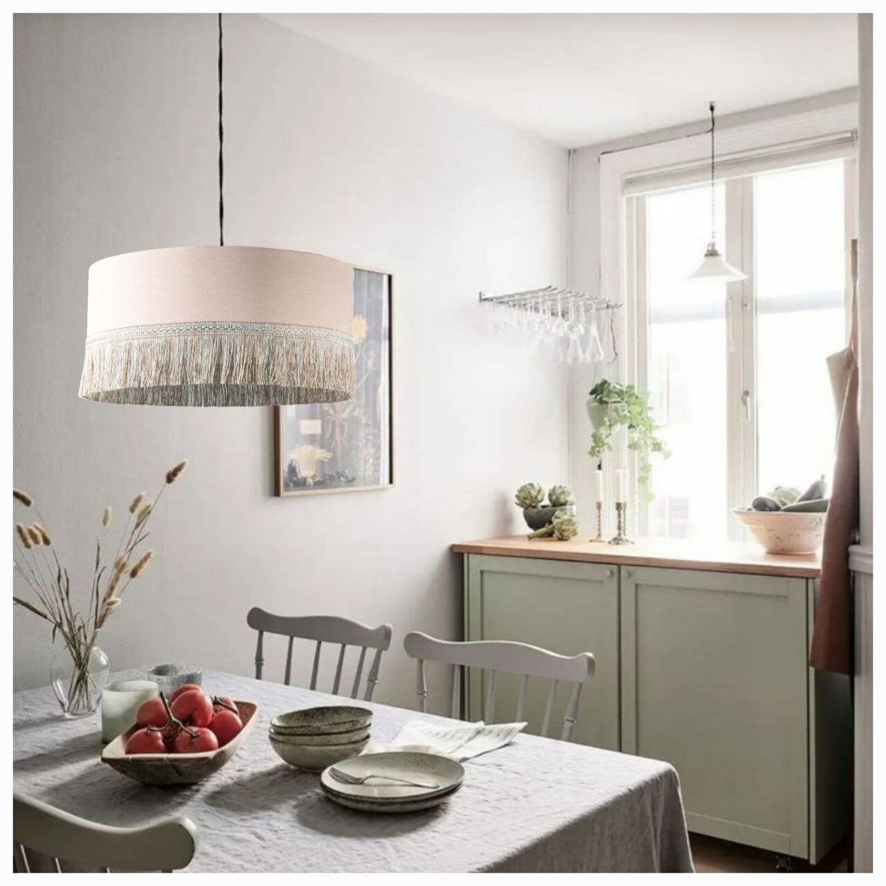 Потолочный абажур от ABA Design Studio – это уникальное сочетание стиля и функциональности. Абажур изготовлен из высококачественного пластика, что обеспечивает его прочность и долговечность. Наружная часть абажура покрыта атласом цвета мокко (бежевый), что придает ему элегантный вид. Внутренняя часть абажура выполнена в белом матовом цвете, что обеспечивает равномерное распределение света. Особое внимание заслуживает фурнитура – шелковая бахрома, в которой сочетаются 2 цвета бахромы Тиффани (голубой) и бежевый , что придает абажуру неповторимый шарм и делает его еще более привлекательным.