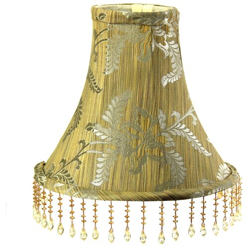 Абажур бежевый с тиснением. Высота - 22,5 см. Верх диам. - 10 см. Низ диам. - 28 см. По нижнему краю украшен стеклярусом. Материал вискоза. Предназначен для настольных ламп.