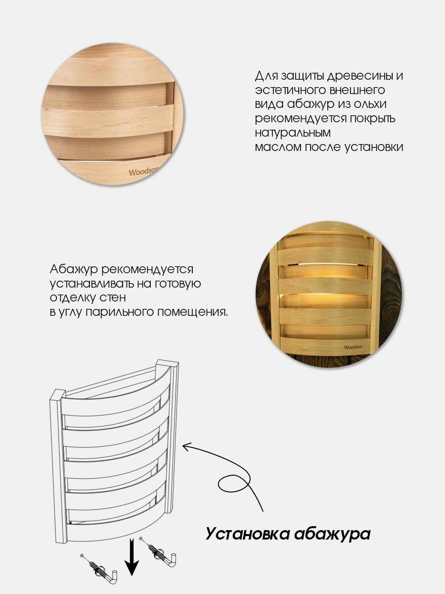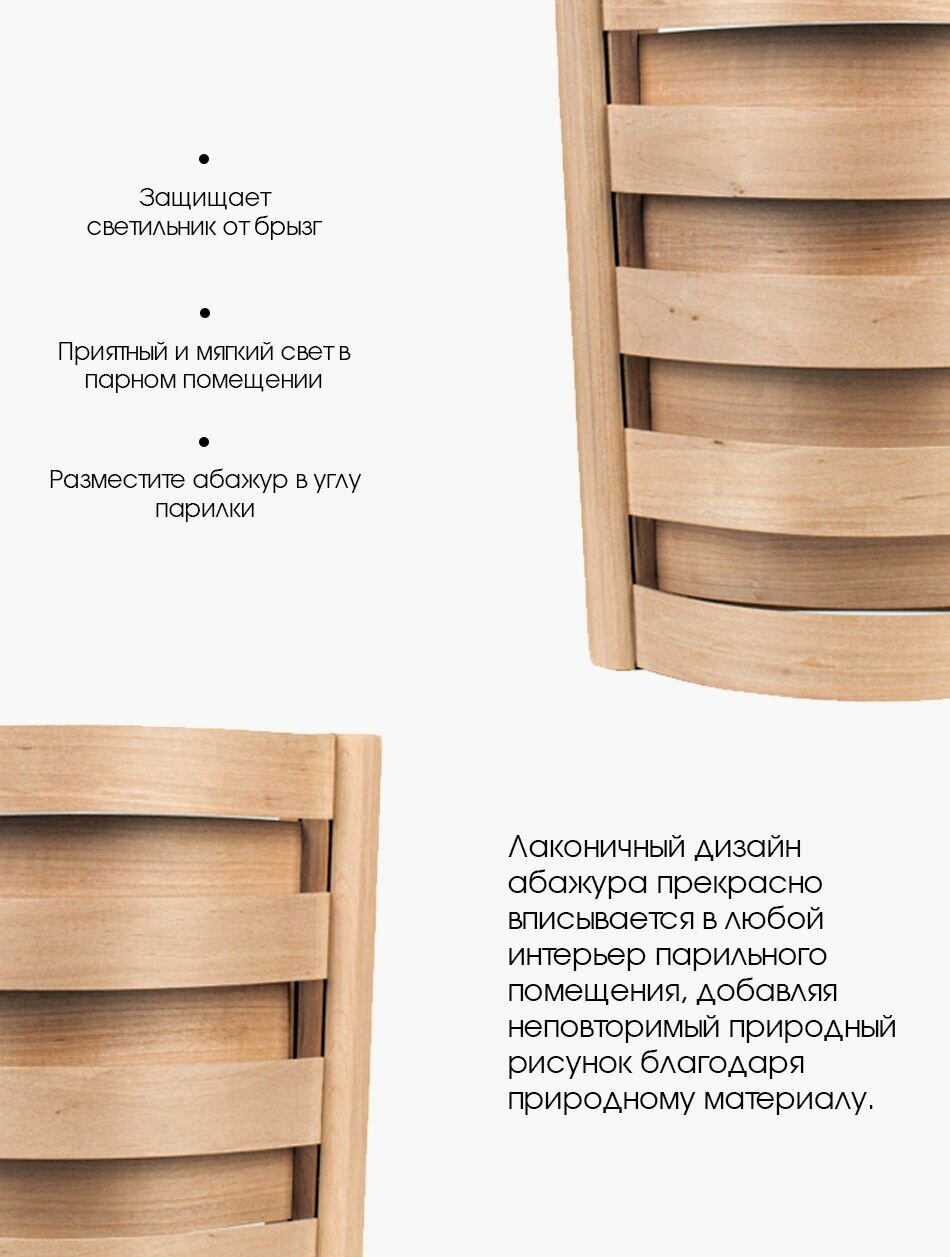 Абажур деревянный для бани и сауны Woodson S1 из кавказской ольхи, с удобным угловым креплением на стену в парилке при помощи крючков: сравнение цен, характеристики, фото, актуальное наличие и цены.