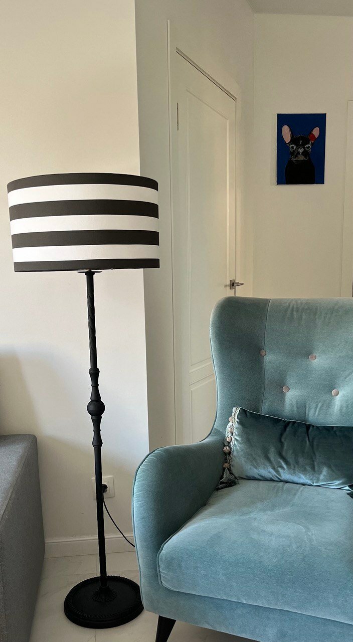 Абажур изготовлен из голландского светотехнического пластика, что обеспечивает его прочность и долговечность. Наружная часть абажура покрыта хлопковой тканью с трендовым принтом "Черно-белая полоска". Внутренняя часть абажура выполнена в белом цвете, что обеспечивает равномерное распределение света.