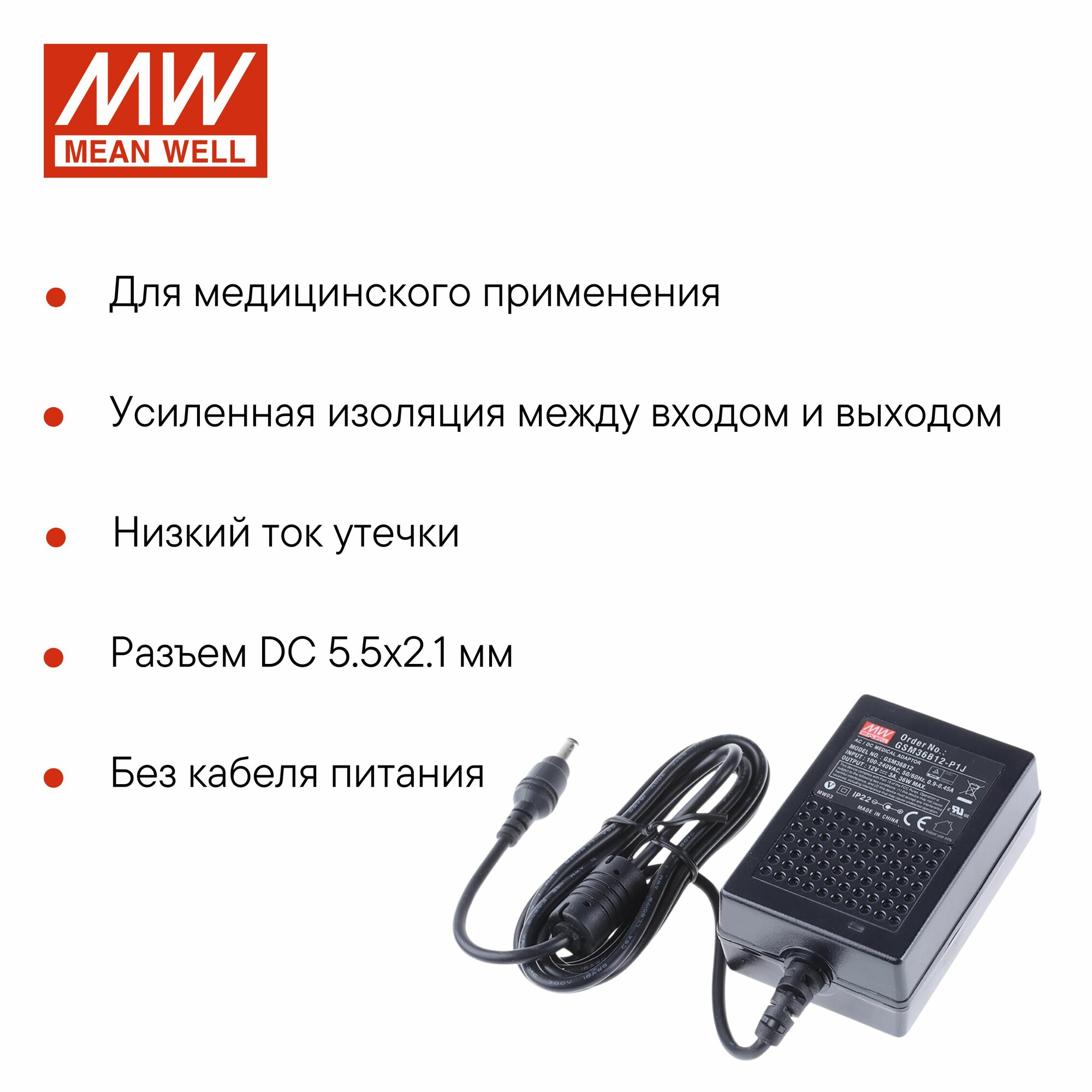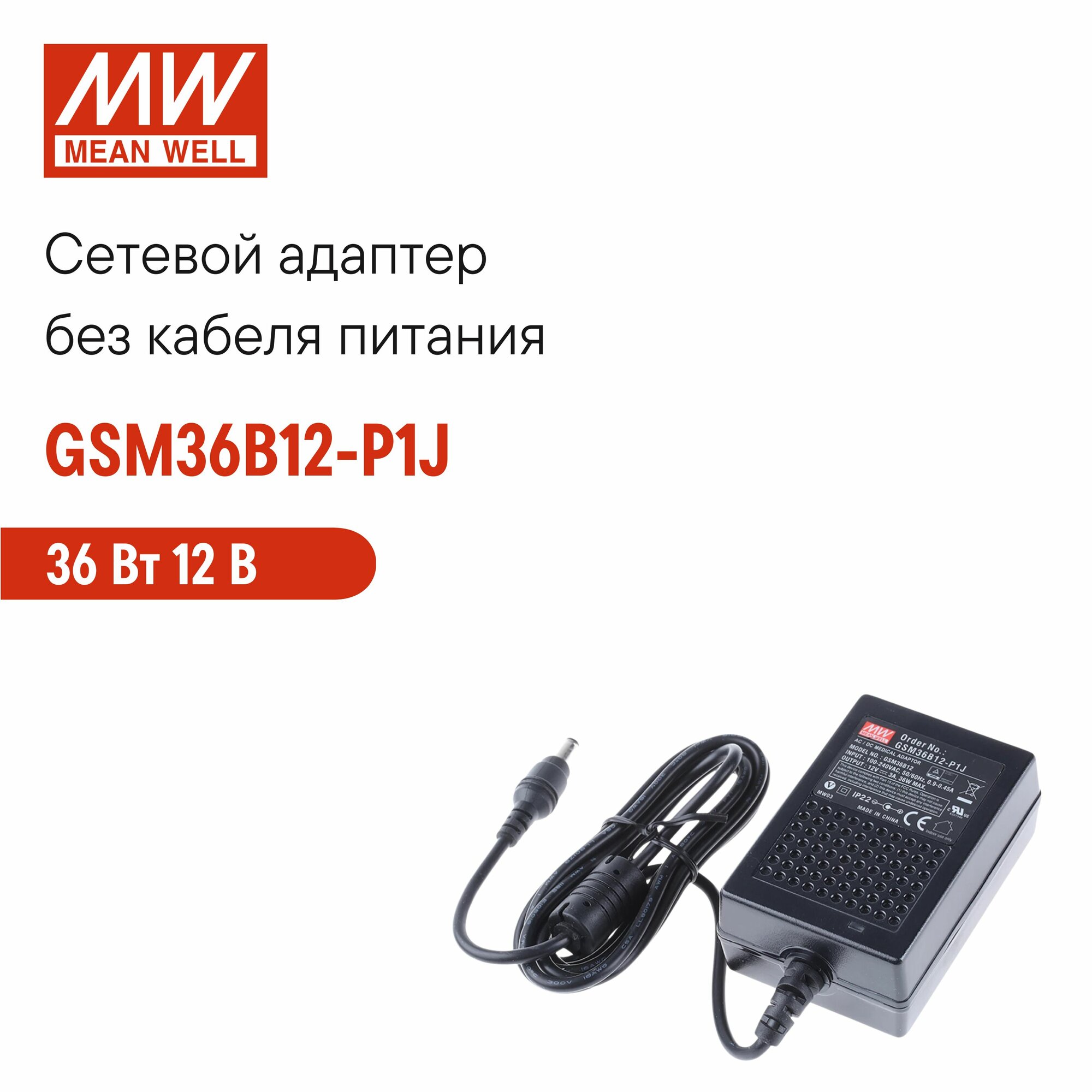 Адаптер питания настольный 12В 3А MEAN WELL GSM36B12-P1J, 36Вт, разъем DC, с усиленной защитой, длина кабеля 1,8 м: сравнение цен, характеристики, фото, актуальное наличие и цены.