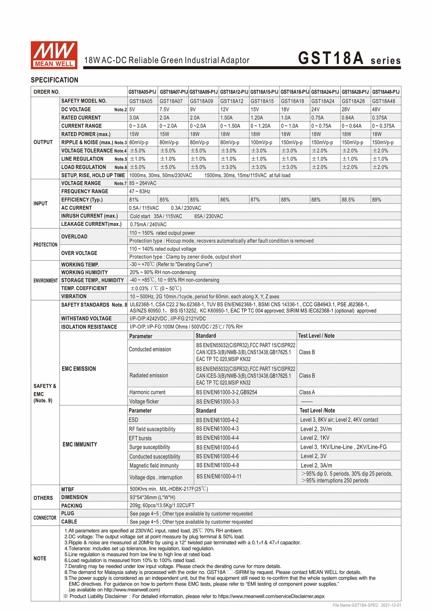 Адаптер питания универсальный настольный 5В 3А MEAN WELL GST18A05-P1J 15Вт, длина кабеля 1,2 метр, разъем DC: сравнение цен, характеристики, фото, актуальное наличие и цены.