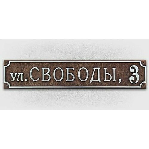 Табличка изготавливается в 3 размерах, 4 фактурах фона, 5 цветах фона, 3 оттенках патины, 2 видах поверхности, из 2 типов металлов — скомбинируйте характеристики на свой вкус и получите действительно уникальный домовой знак. Табличка, разработанная по индивидуальному эскизу, будет единственной в буквальном смысле этого слова — второй такой вы не встретите ни в России, ни в мире.
