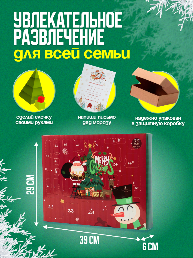 | Комплектация | Адвент календарь "Merry Christmas"- 1шт; Подарок "Письмо деду Морозу с конвертом"- 1шт; Подарок "Сделай елочку своими руками"- 1шт |