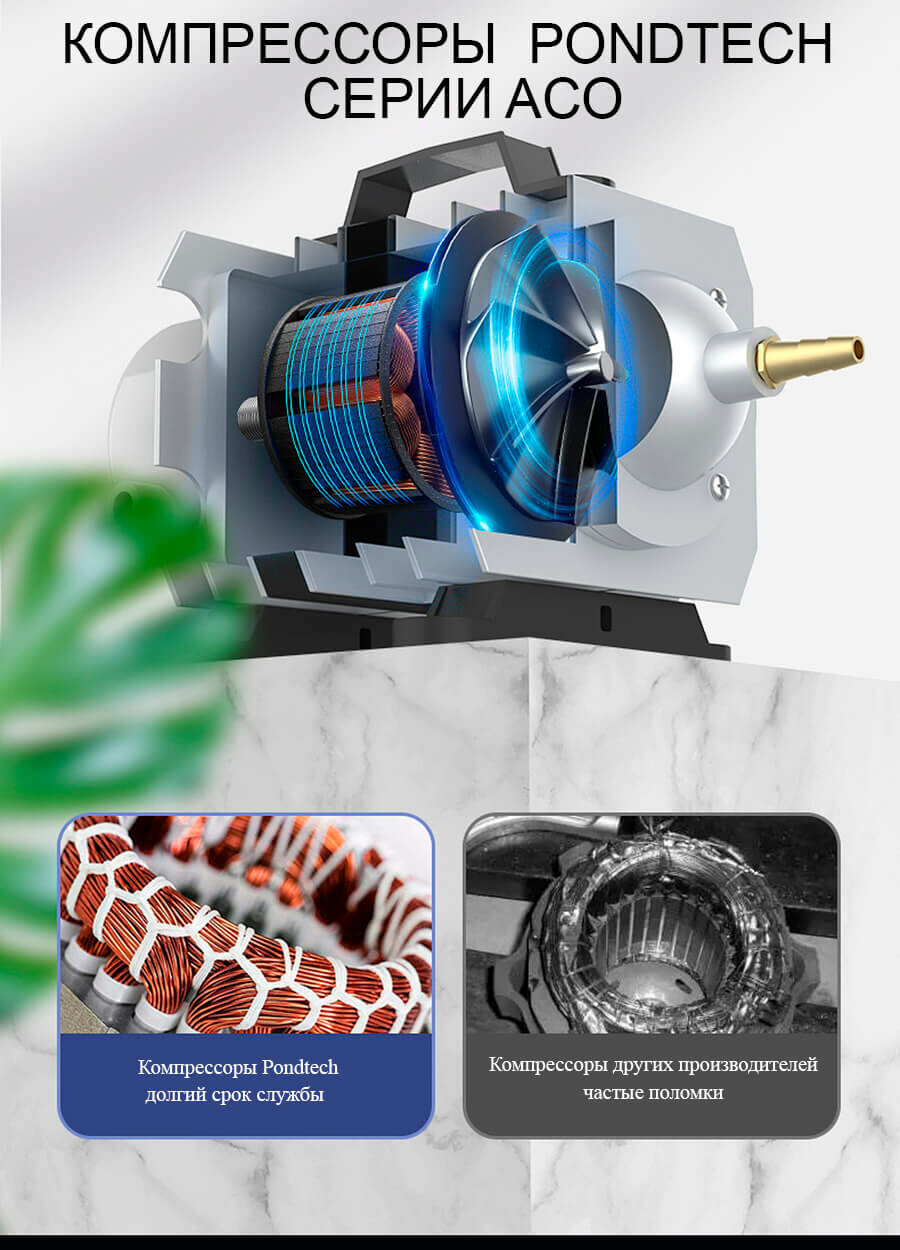 Основным предназначением компрессора аэратора для пруда септика аквариума ACO 007 Pondtech является обогащение воды кислородом , который необходим для жизнедеятельности флоры и фауны. Благодаря снабжению воды кислородом достигается баланс и замедляется заиливание. Компрессоры Pondtech универсальные, подходят для аквариумов, прудов, септиков, рыбных хозяйств, пузырьковых панелей, коптилен.