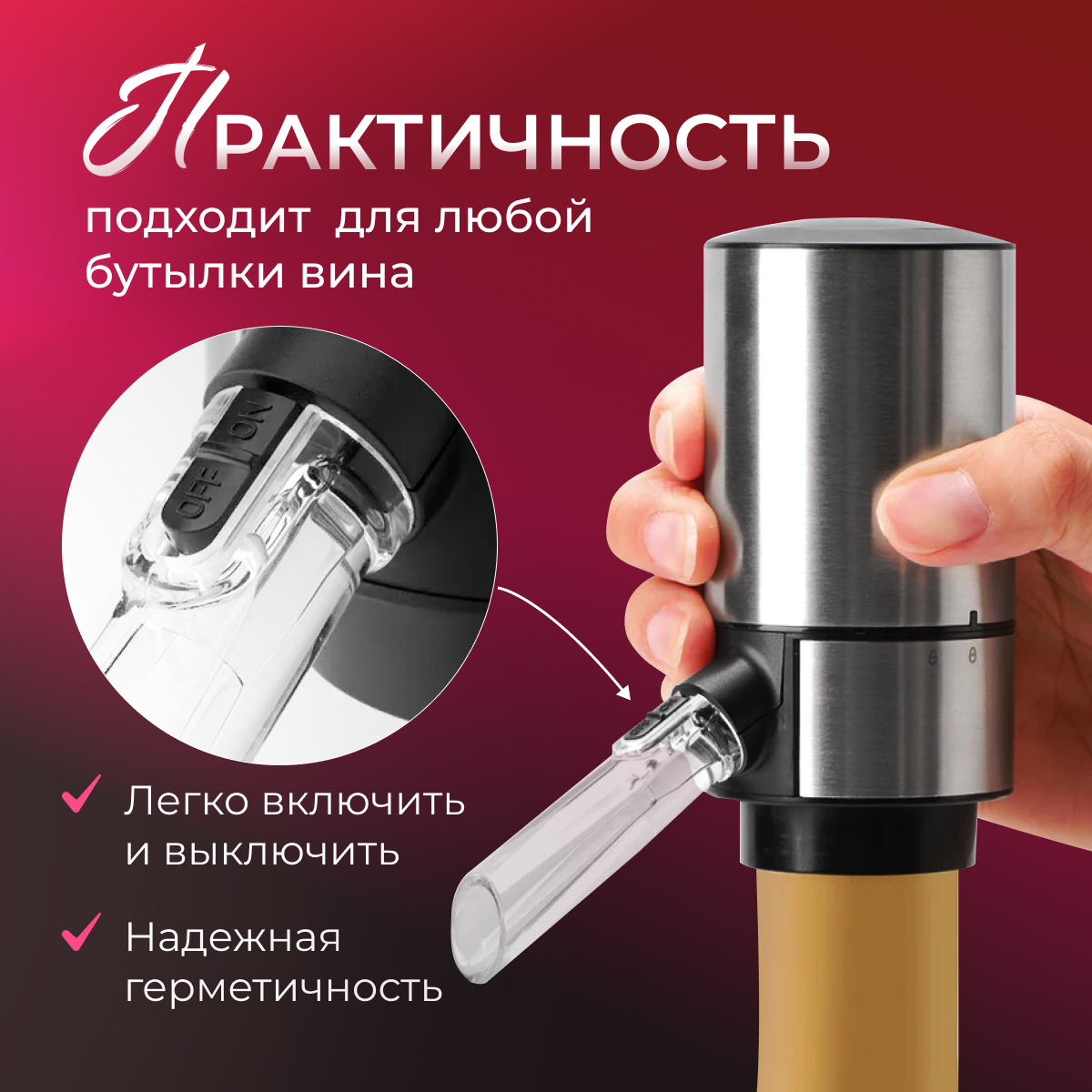 Барные принадлежности совместимы с любыми бутылками и имеют простую, но максимально продуманную конструкцию, которую с легкостью сможет использовать каждый. Управлять аэрацией насадки очень просто - возле горлышка предусмотрены специальные кнопки.