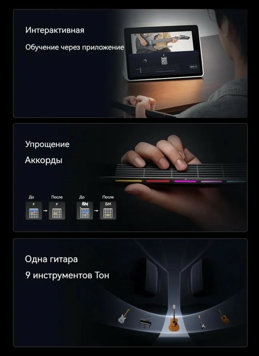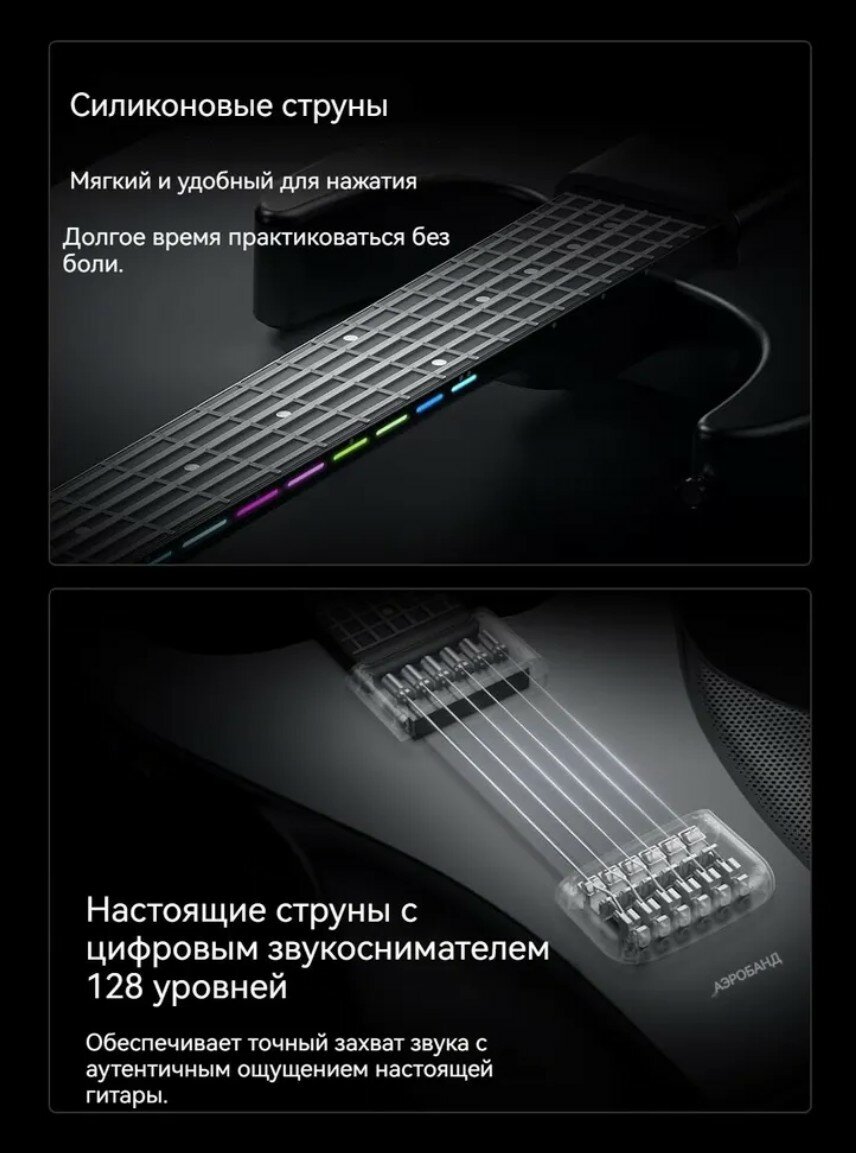 AeroBand Guitar AG01 — смарт-гитара нового поколения. Умная электрогитара с инновационными силиконовыми струнами обеспечивает комфортную и безболезненную игру, идеально подходя как для начинающих, так и для опытных музыкантов. До 8 тембров и 25 строев переключаются одним нажатием — забудьте о долгой настройке. Встроенная драм-петля помогает создавать полноценные композиции в реальном времени.