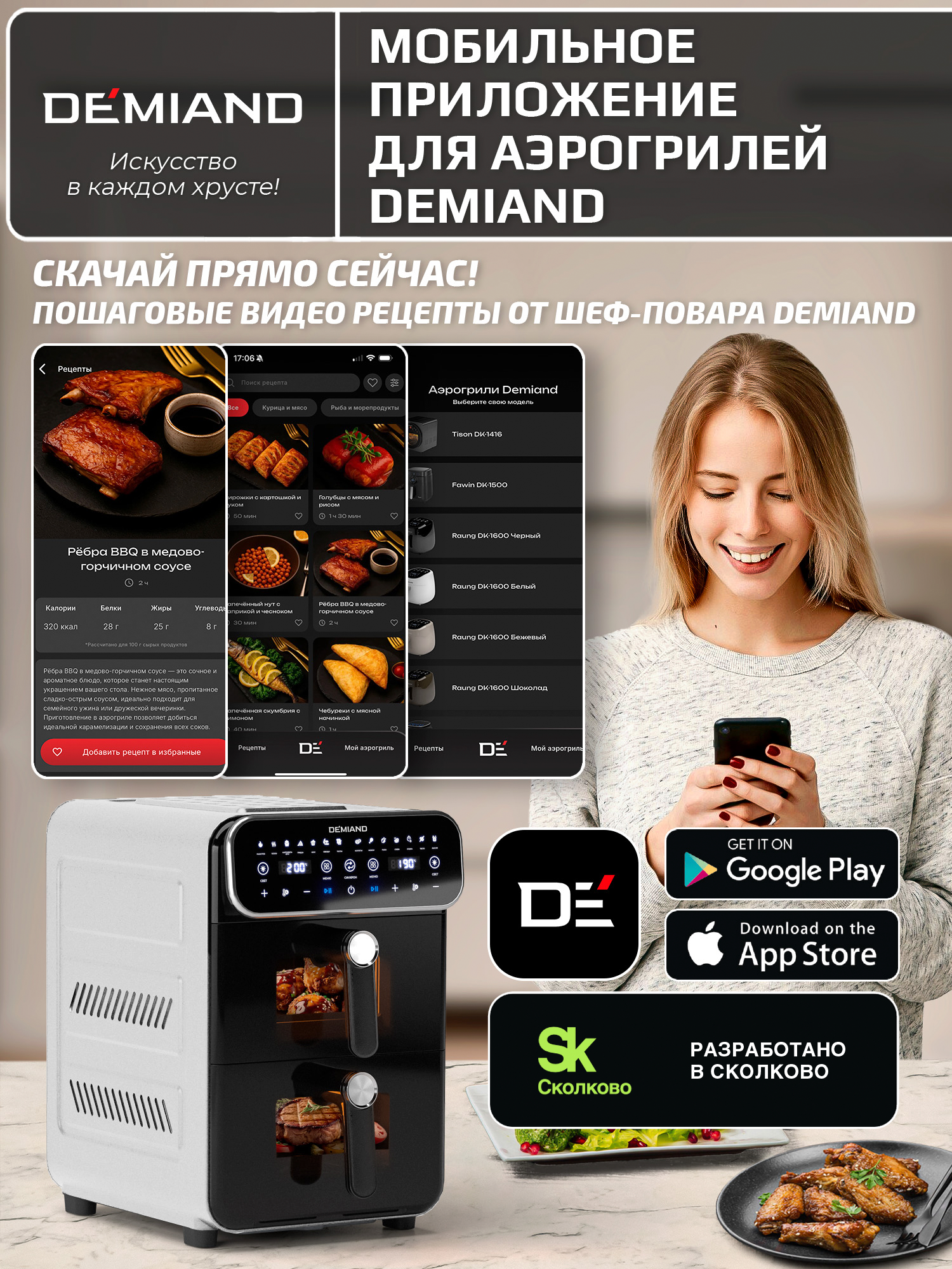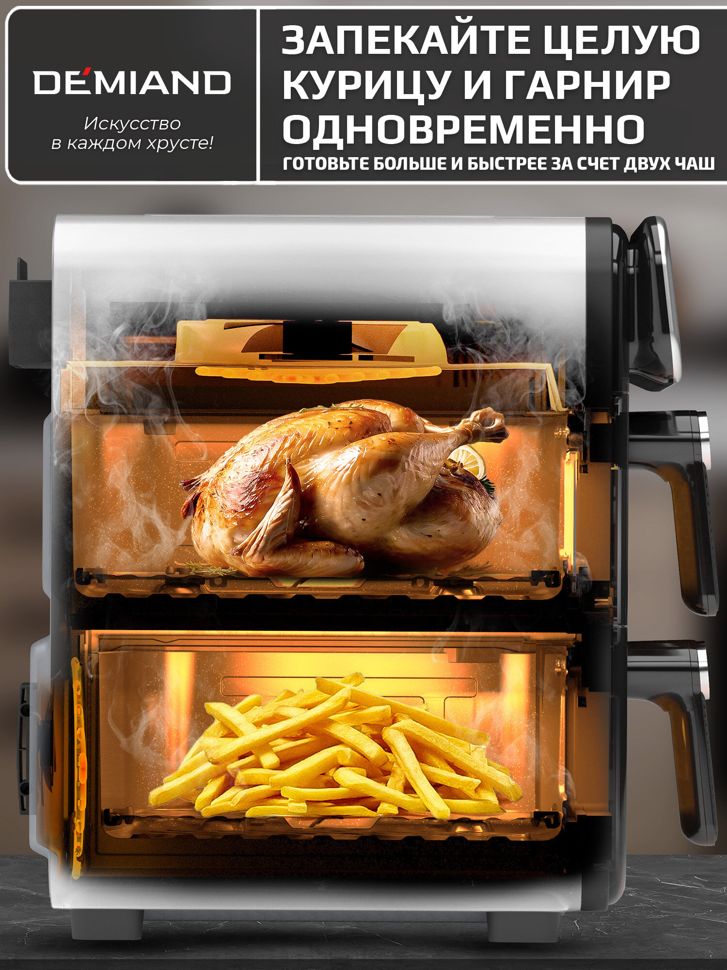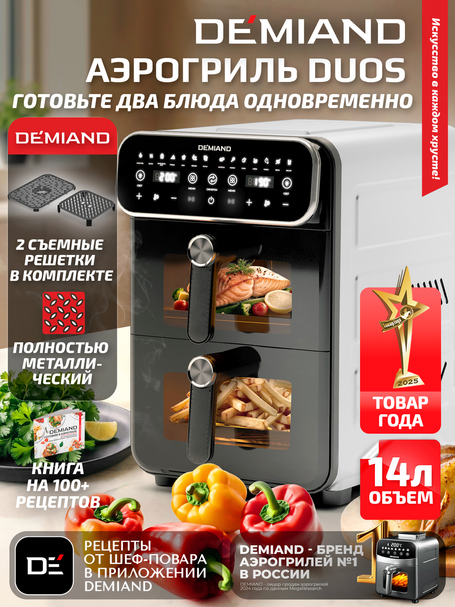 Купить Аэрофритюрница DEMIAND «DUOS», 3200Вт, 14л, 2 чаши, автоматические программы, белая с доставкой по всей России.