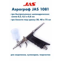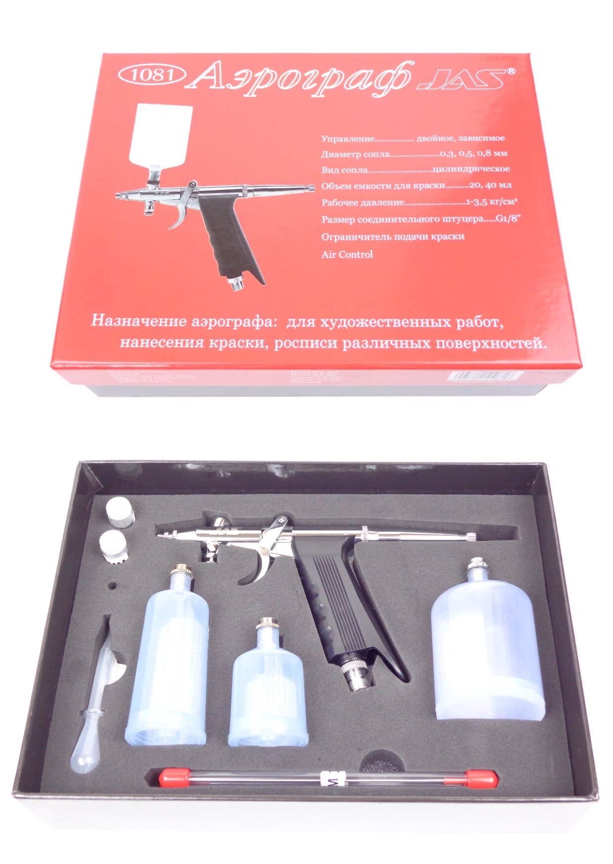 Аэрограф Jas 1081 - аэрограф пистолетного типа в комплекте с установленным цилиндрическим безрезьбовым соплом 0,3 мм. Также в наборе распылительные комплекты (сопло, игла, корпус диффузора) 0,5 и 0,8 мм. Ёмкости под краску объёмом 20, 40 и 75 мл. Отличительная особенность - цилиндрическое сопло и высокопрочная игла. Снятие и установка сопла без каких-либо ключей. Функция Air control позволит выставить необходимое давление воздуха, подаваемое аэрографом.