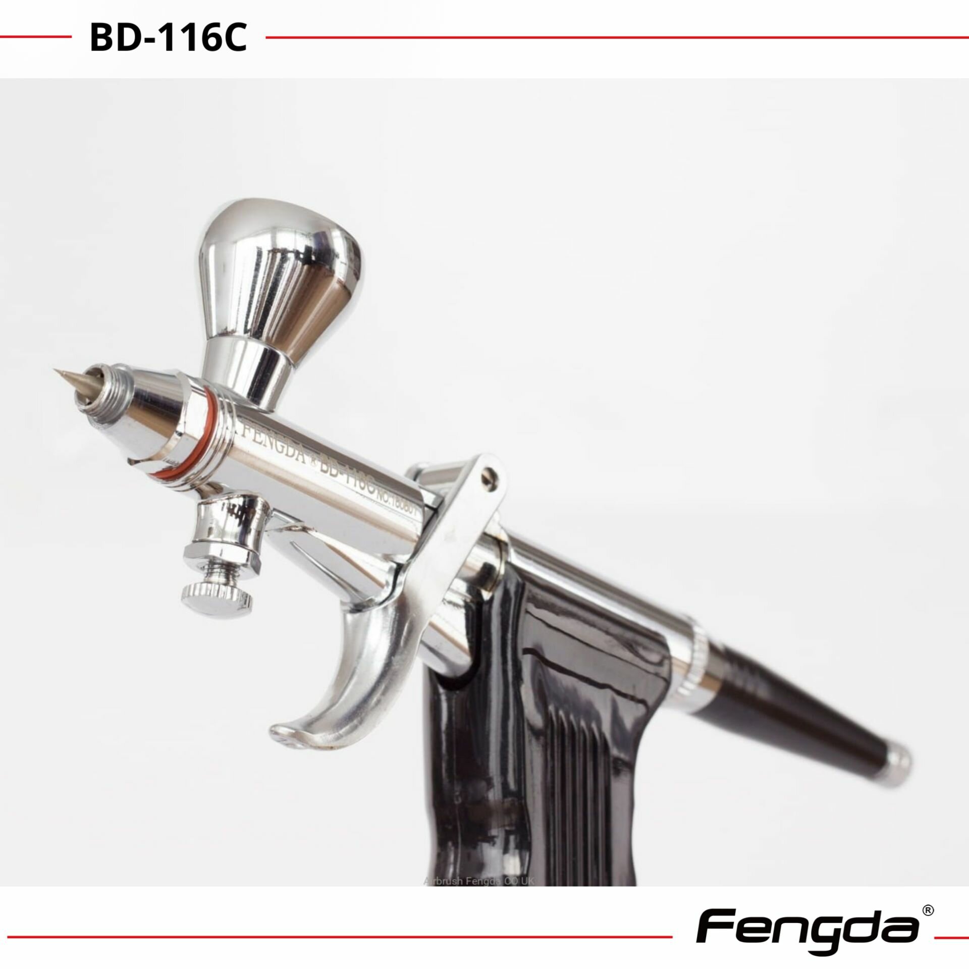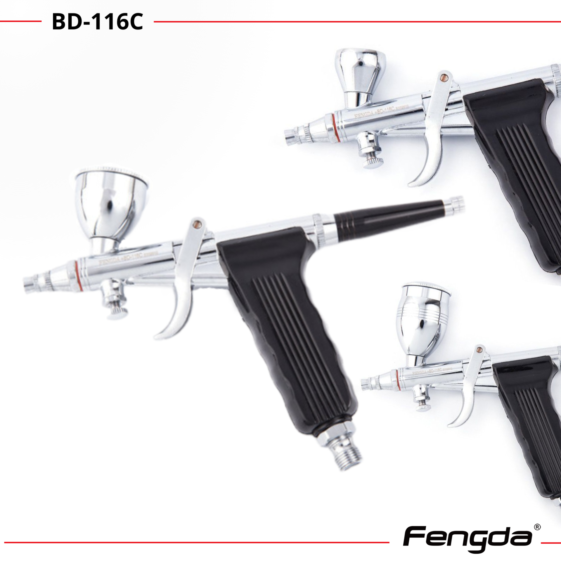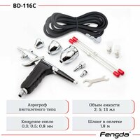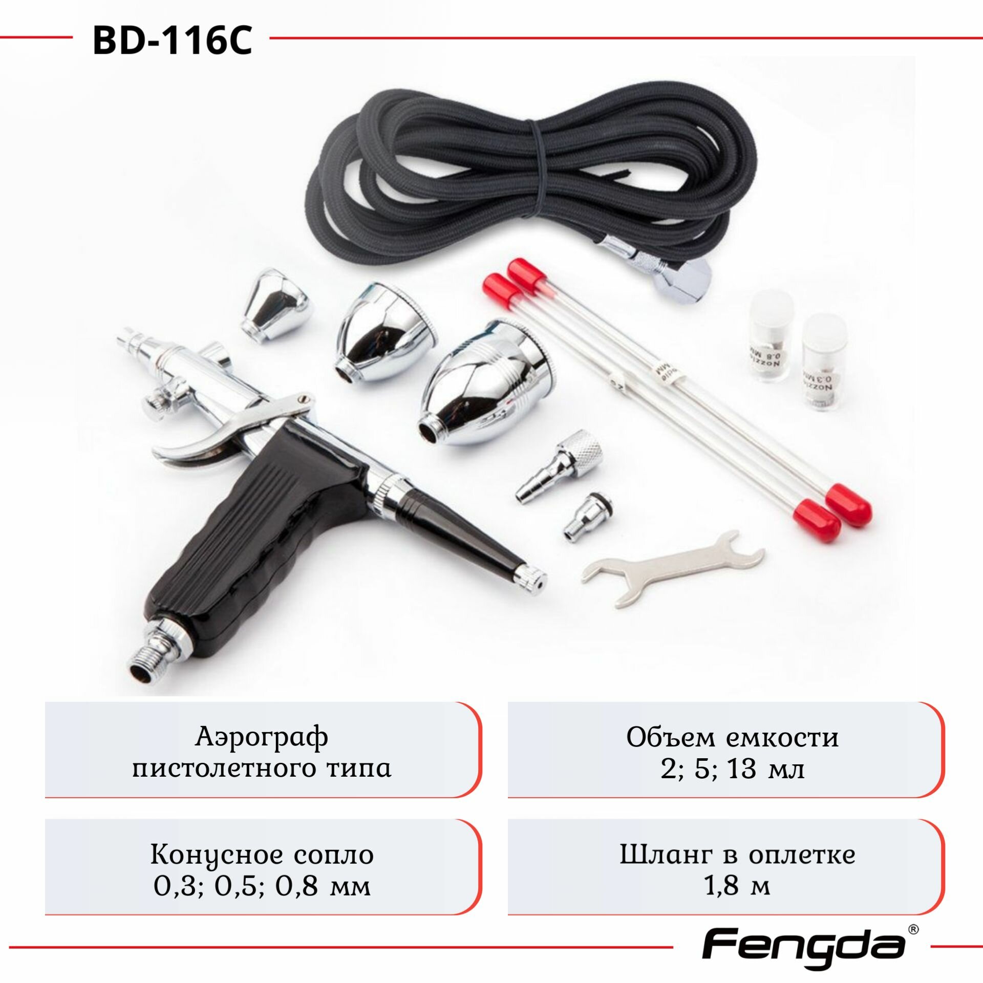 Fengda BD-116С представляет собой комплект, включающий удобно лежащий в руке и оптимально подходящий для фоновых работ аэрограф пистолетного типа. Поскольку найти недорогой аэрограф-пистолет на рынке художественных товаров достаточно сложно — данная модель является в своём роде уникальной.