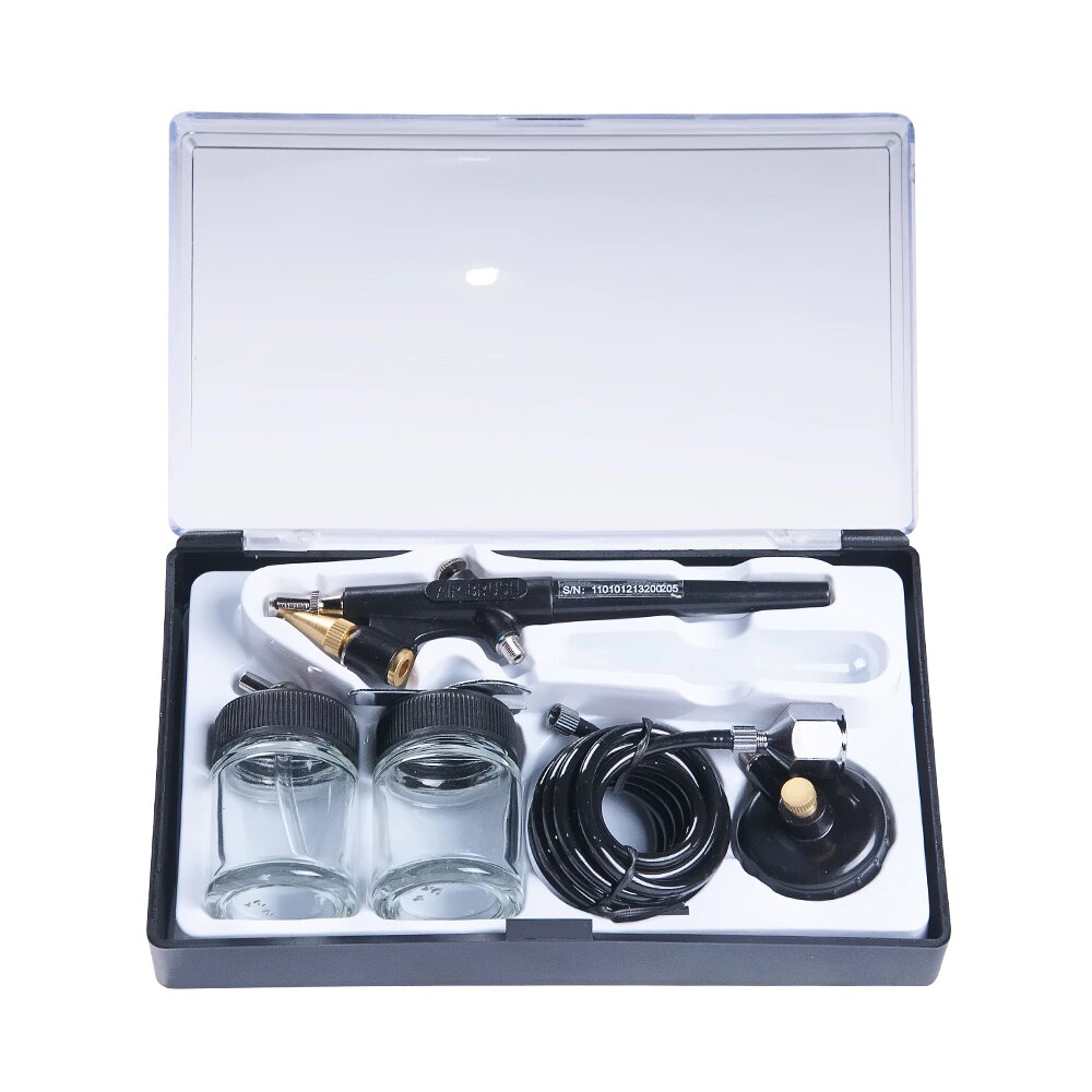 аэрограф, инструкция по эксплуатации, 2 бачка для краски 22мл., шланг 2,5х4мм. длина 2м., дополнительная крышка для бачка, переходник для шланга М1/4, пипетка, ключ.