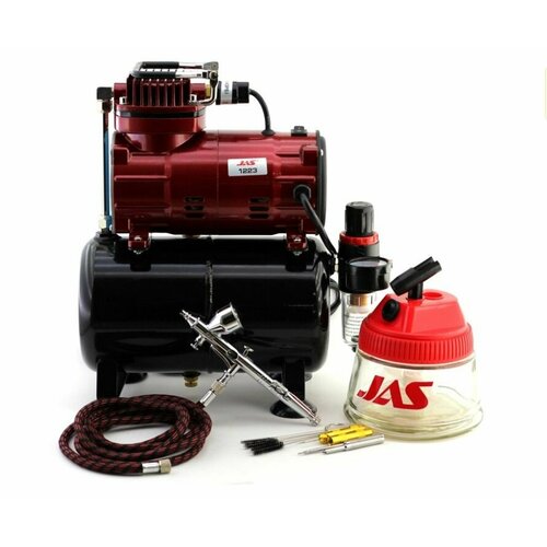 JAS 1223 имеет производительность 23 литра в минуту, оснащён редуктором для регулирования давления, автоматикой, отключающей компрессор при достижении 4 бар и включающей при падении давления до 3 бар, фильтром-влагоуловителем, а также манометром.