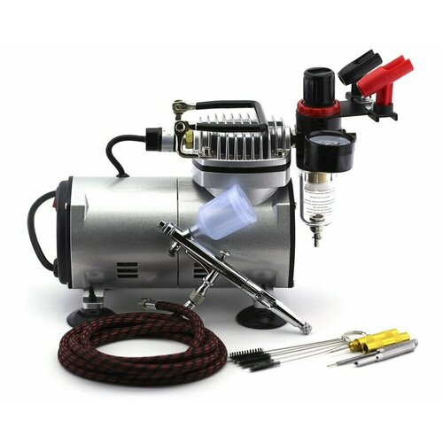 Компрессор оснащен всем необходимым оборудованием. Регулятор давления позволяет работать в диапазоне 0,2 - 4 атмосфер. Встроенный фильтр на выходе отчищает воздух от пыли и влаги, что очень актуально при работе с аэрографом. Компрессор оборудован защитой от перегрева и повышенного давления. При достижении опасного уровня давления или температуры компрессор автоматически отключается. Имеет автоматический регулятор давления - выключает компрессор, когда его не используют, включает, как только возобновляется подача воздуха в аэрографе.