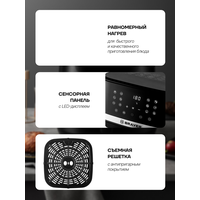 Сенсорное управление и LCD-дисплей делают использование аэрогриля простым и удобным. Регулировка температуры от 80 до 200 градусов позволяет готовить разнообразные блюда, а таймер до 60 минут обеспечивает точное соблюдение времени приготовления.