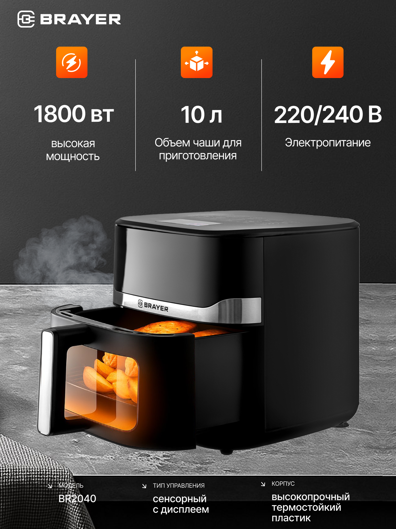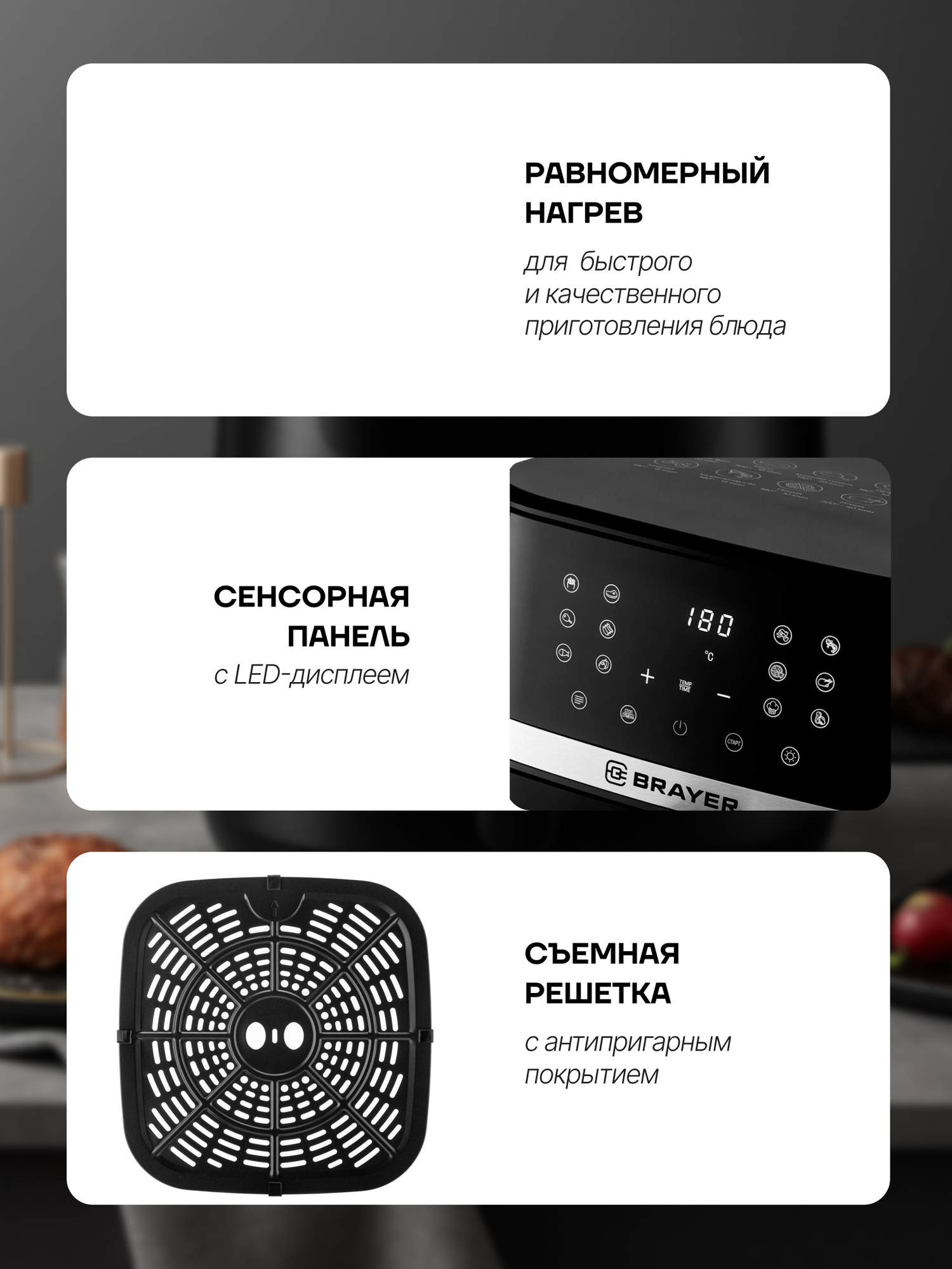 Аэрогриль BRAYER BR2040 - это современное устройство для приготовления пищи, которое сочетает в себе функциональность и удобство использования.