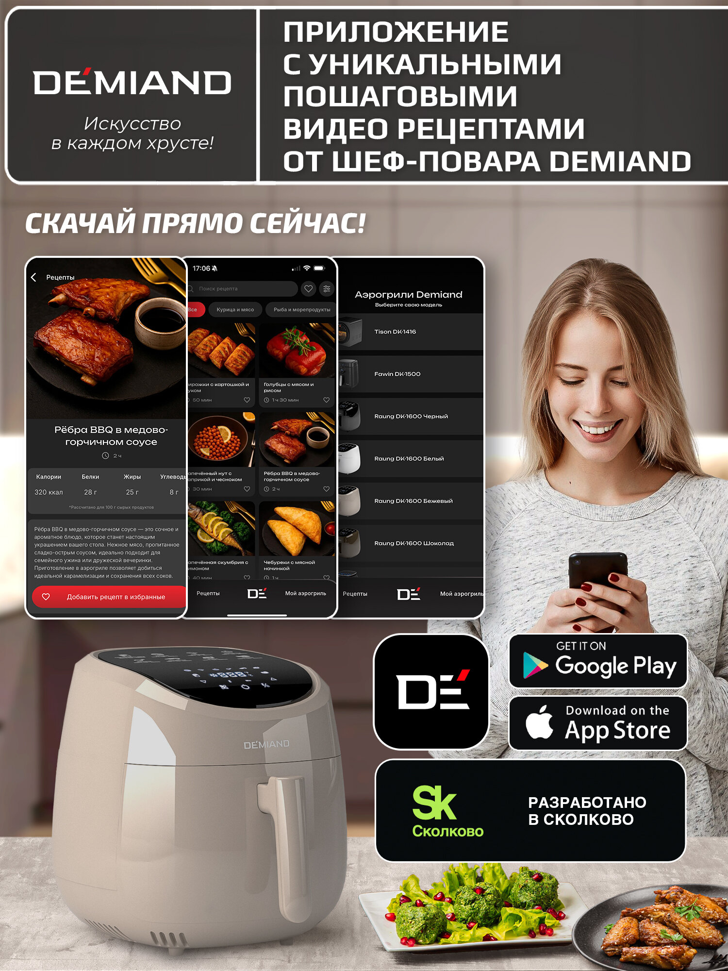 Этот аэрогриль предназначен для жарки, запекания, выпечки с эффектом гриля, при этом продукты равномерно обжариваются со всех сторон, и блюда получаются с хрустящей корочкой снаружи и нежные внутри. Полностью автоматические программы для приготовления картофеля-фри, пиццы, овощей, выпечки, куриных ножек, морепродуктов, рыбы и стейков, с оптимальным использованием температуры и времени приготовления.