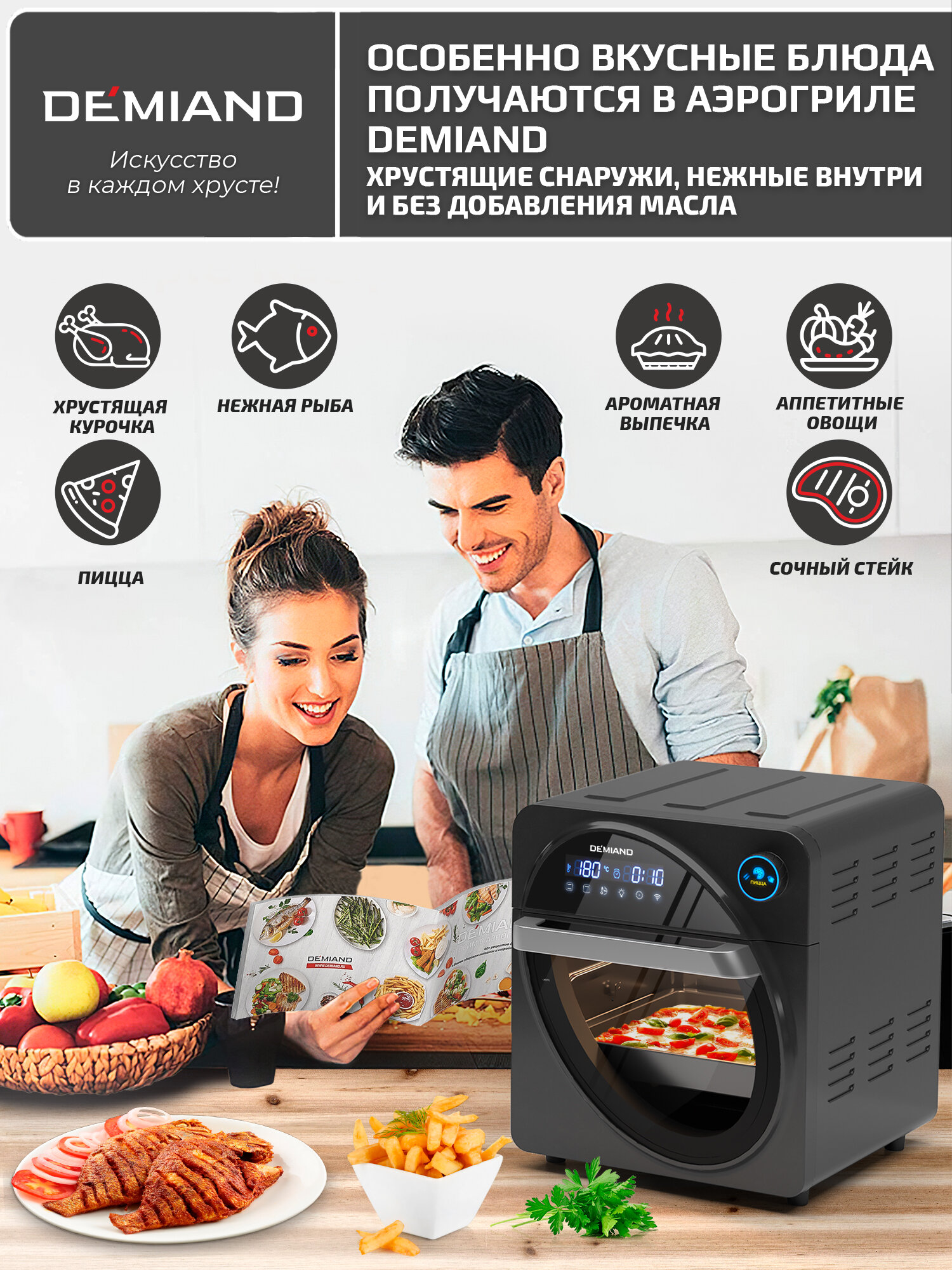 Многофункциональный аэрогриль DEMIAND Waison с Wi-Fi управлением — ваша универсальная кухонная техника. Готовьте с эффектом гриля, разогревайте без СВЧ-излучения, запекайте, сушите продукты и делайте выпечку! Технология FAST HOT AIR обеспечивает циркуляцию горячего воздуха на 360°, что позволяет готовить на 30% быстрее обычной духовки, с минимальным количеством масла, экономя до 80% электроэнергии.