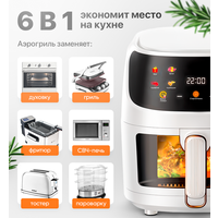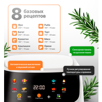 Данная модель подходит как для начинающих кулинаров, так и для опытных хозяек. Управление аэрогрилем легкое и интуитивно понятное. В его конструкции предусмотрены различные режимы приготовления, позволяющие подстраивать процесс под свои предпочтения. С ним вы сможете запекать, жарить, гриллировать и даже размораживать продукты.