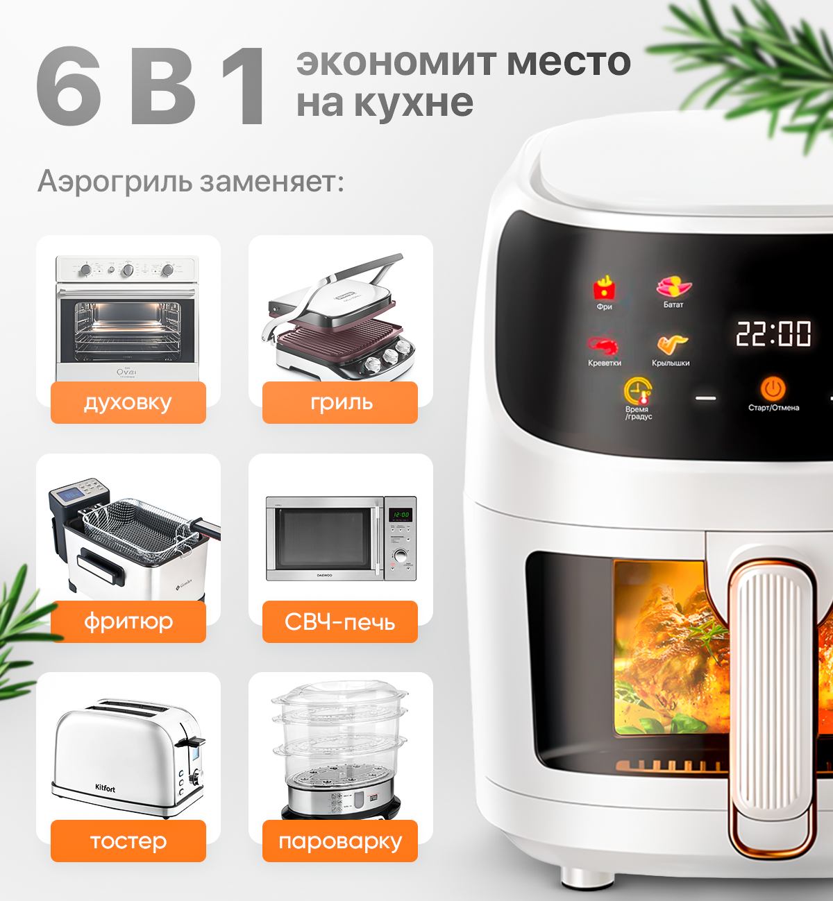 Совместив в себе качество, функциональность и лишь минимальные размеры, данный аэрогриль станет вашим лучшим другом при приготовлении быстрых и здоровых блюд. Не упустите возможность сделать ваши кулинарные эксперименты проще, быстрее и вкуснее с этим замечательным кухонным прибором.