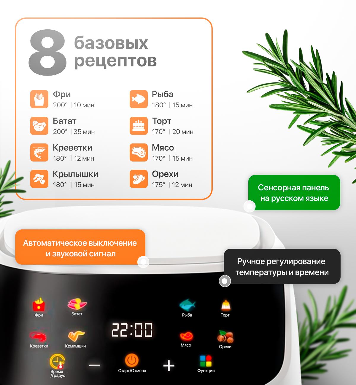 Аэрогриль также отличается высоким уровнем безопасности: предусмотрены защитные функции, предотвращающие перегрев и короткое замыкание. Его современный и стильный дизайн прекрасно впишется в любой интерьер кухни.