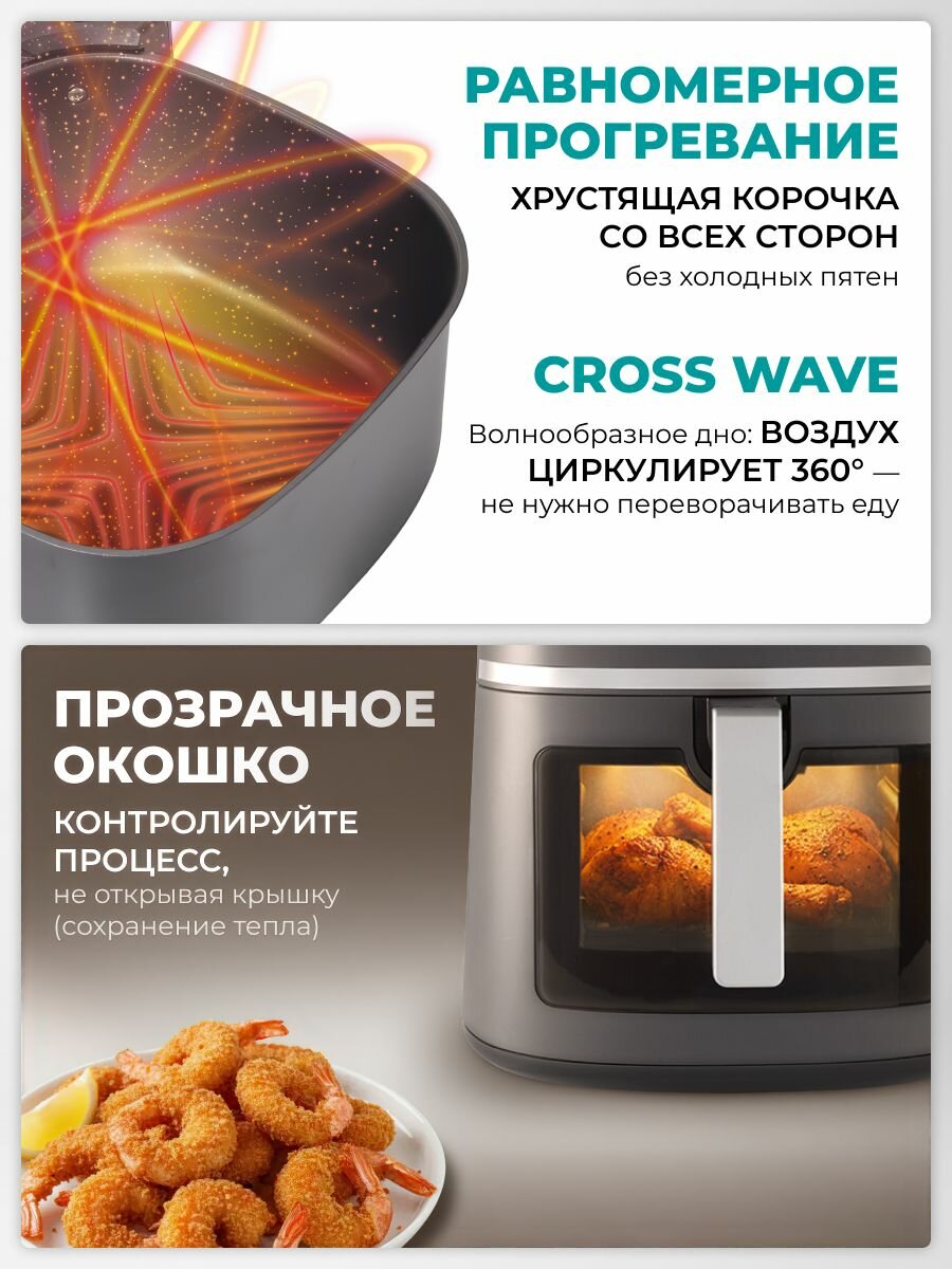 Благодаря оптимальному распределению потоков горячего воздуха за счет волнообразного дна Cross Wave, электрическая фритюрница готовит быстрее, чем духовка. Готовые блюда получаются с хрустящей корочкой, при этом с минимальным добавлением масла или совсем без него. Гриль имеет 10 автоматических программ, в том числе курица, картофель, рыба, овощи, выпечка и тд. Дополнительные функции разморозки и разогрева пищи, запускаются одним нажатием кнопки, а режим сохранения тепла будет поддерживать еду теплой в течение 20 минут после окончания цикла. Встроенный таймер и прозрачное окошко помогут проконтролировать процесс приготовления.