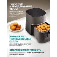 Диапазон температур электро прибора от 40°C до 200°C позволяет подобрать индивидуальные условия для различных кулинарных задач, кроме того, доступна опция сушки. Благодаря циркуляции на низких температурах продукты теряют влагу, сохраняя свой вкус и питательные вещества. Объем настольной печки 7 литров идеален, чтобы приготовить любимое угощение для всей семьи: от картошки фри и запеченного мяса, до сырников и сладких десертов. Чаша и решетка с антипригарным покрытием легко очищается, что обеспечивают удобство и простоту в уходе за устройством.