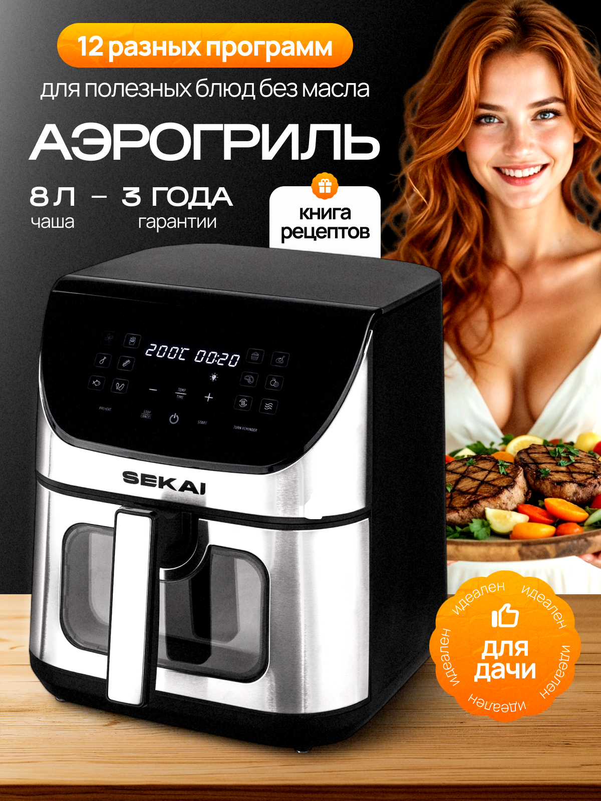 Со своей мощностью и температурным диапазоном этот аэрогриль позволяет вам готовить быстро и легко, не теряя вкусовых качеств продуктов. Прозрачное окно с подсветкой дает возможность контролировать процесс приготовления, не открывая крышку и не нарушая температурный режим.