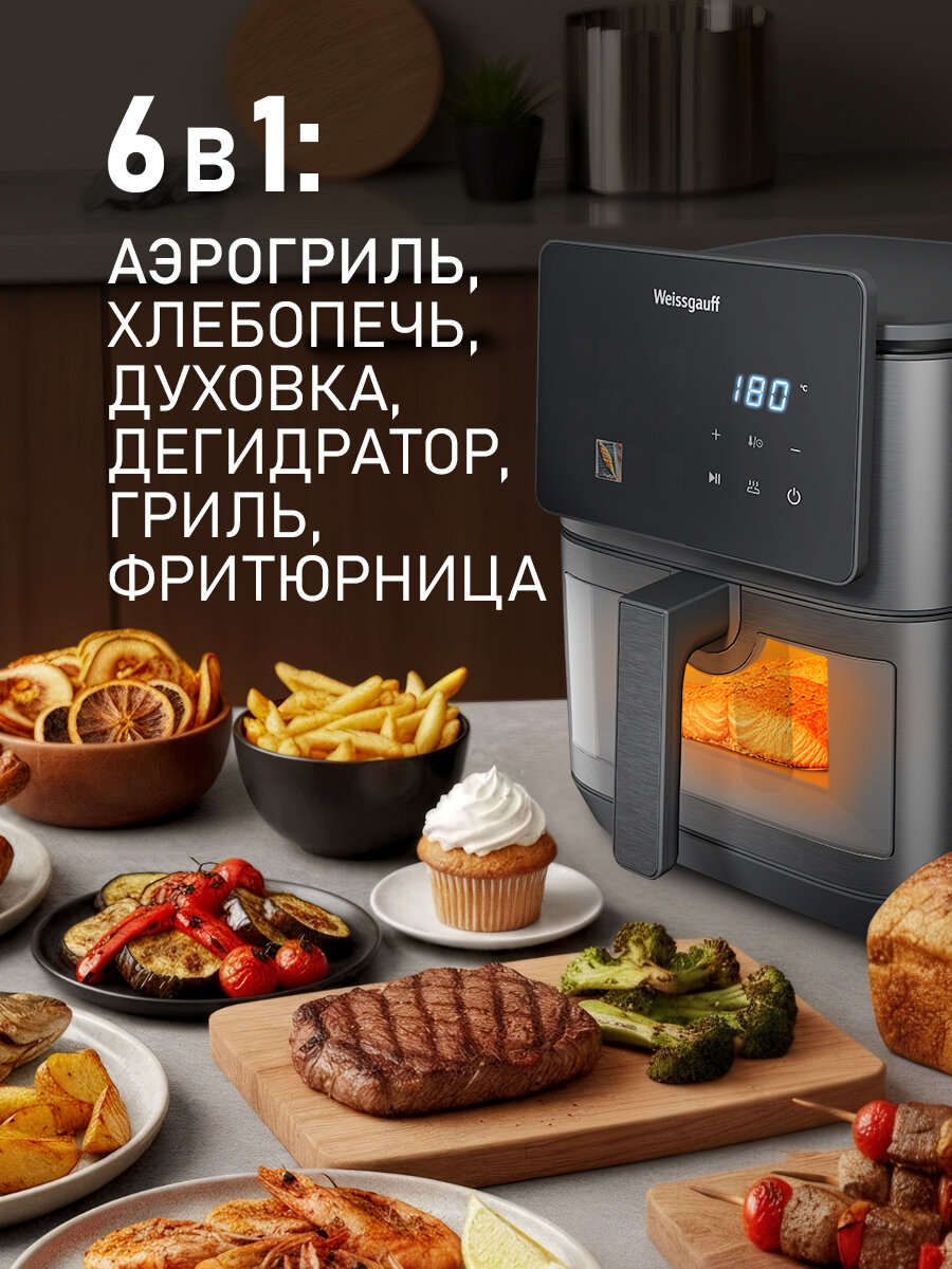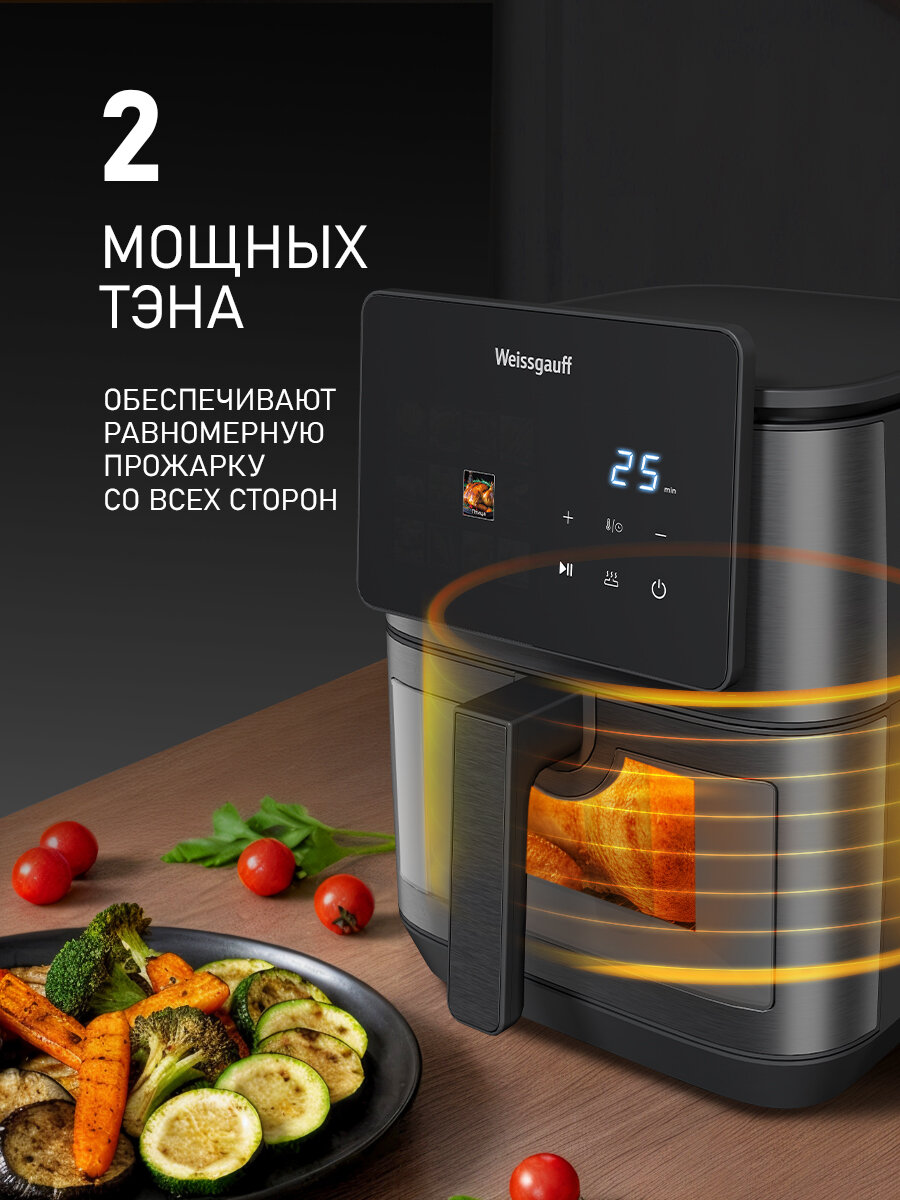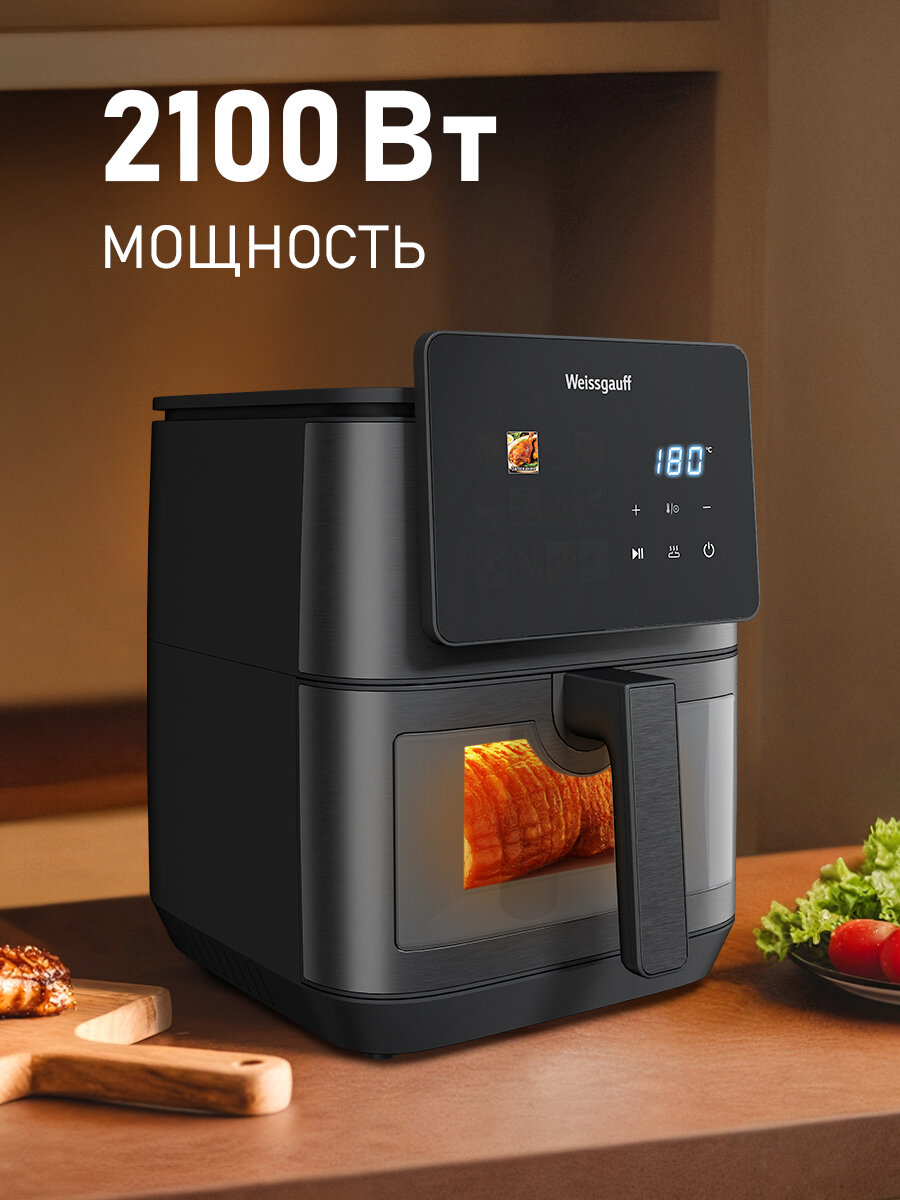 Аэрогриль от Weissgauff, является инновационным решением для вашей кухни. Этот многофункциональный прибор открывает новые горизонты в кулинарии, объединяя в себе несколько бытовых кухонных приборов. Благодаря современному и стильному дизайну, устройство станет украшением любой кухни, сочетая в себе элегантность и функциональность, компактные размеры, объём 9 литров и мощность 2100 Вт позволяют быстро и эффективно создавать огромное количество разнообразных блюд, а также экспериментировать и находить новые кулинарные рецепты. Наслаждайтесь вкусом любимых блюд без лишних калорий, ведь технология обжарки с использованием горячего воздуха сохраняет вкус и питательные свойства продуктов, а простота управления и наличие разнообразных программ превращают готовку в настоящее удовольствие!