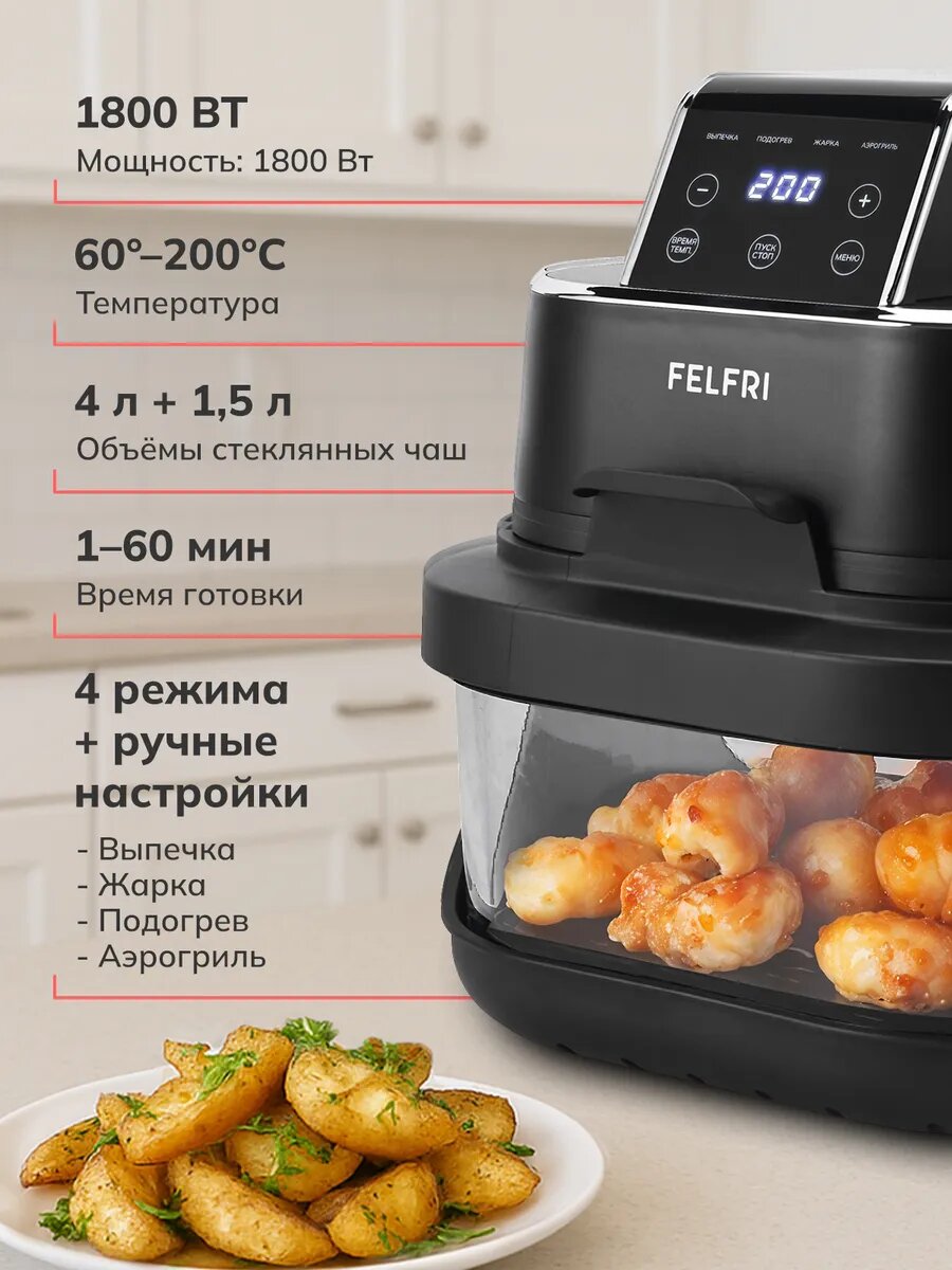 Аэрогриль FELFRI, 4 программы приготовления, 1.5- и 4-литровые чаши, мощность 1500 Вт: сравнение цен, характеристики, фото, актуальное наличие и цены.