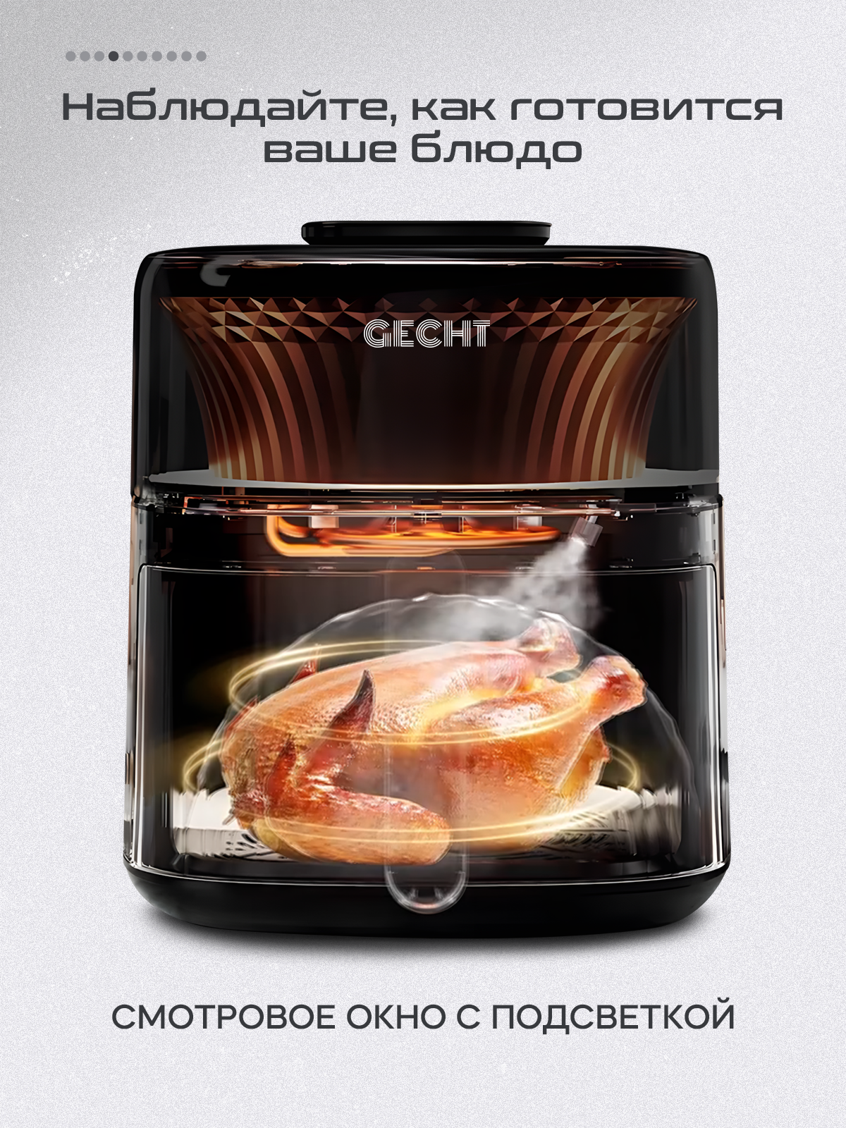Маленькая умная помощница airfryer нового поколения для дома и дачи дает возможность готовить вкусно с минимальными затратами сил и времени. Домашний мультиповар аэрогриль Gecht – это идеальный выбор для тех, кто ценит быстроту и качество приготовления пищи. Наслаждайтесь вкусом и пользой с качественной и надежной бытовой техникой Gecht. Не упустите возможность сделать вашу кухню более функциональной и удобной!