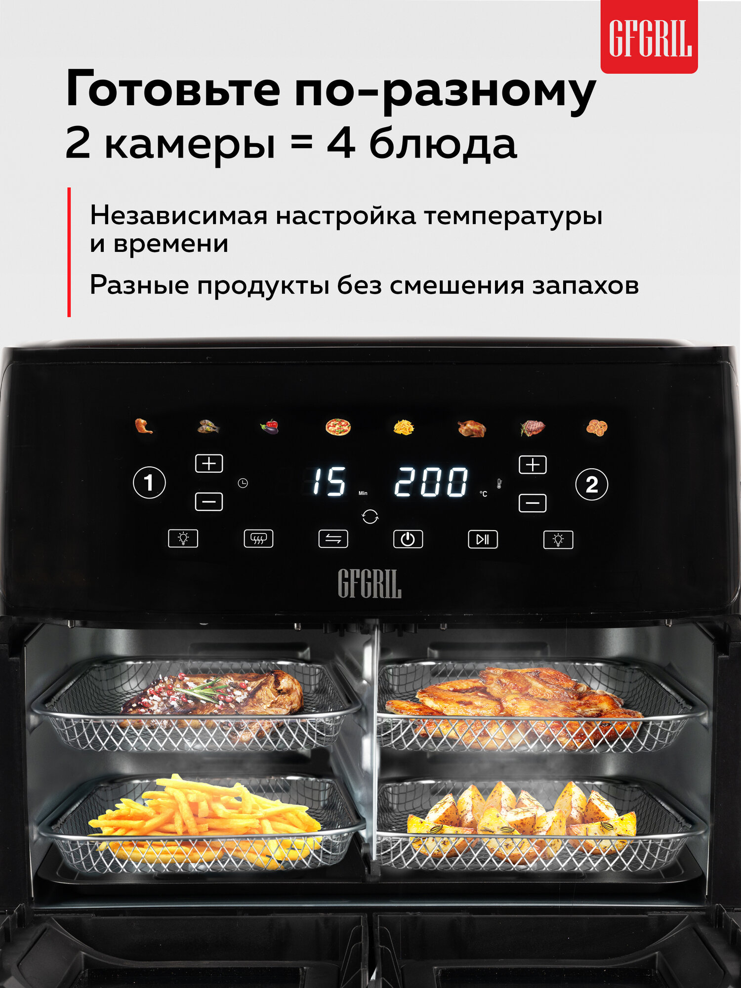 Купить Аэрогриль GFGRIL GFA-9400, 2 камеры с разделителем, 13 л с доставкой по всей России. Аэрогриль GFGRIL GFA-9400, 2 камеры с разделителем, 13 л: сравнение цен, характеристики, фото, актуальное наличие и цены.