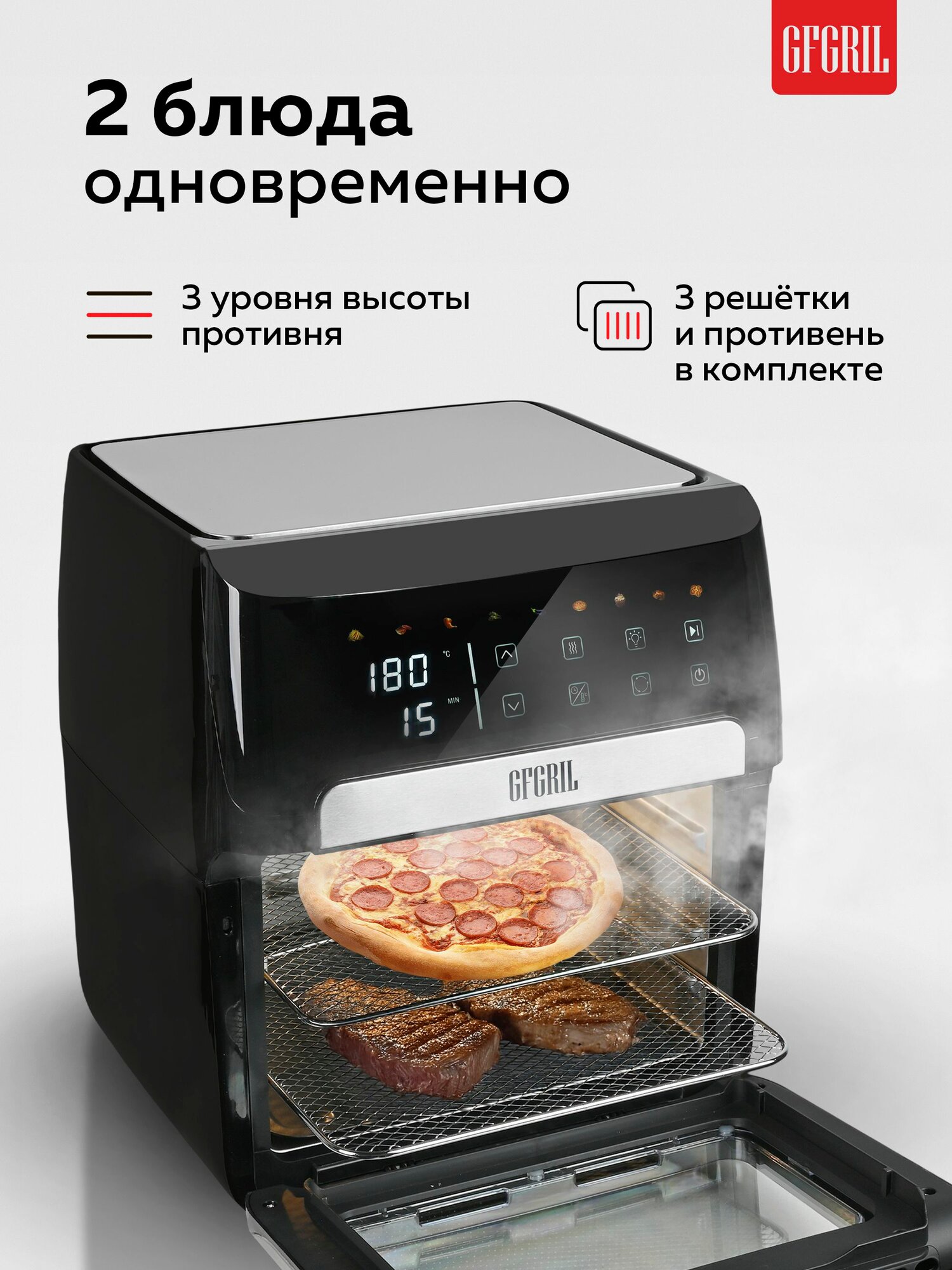 Аэрогрили - это современный подход к домашнему питанию. Электрический аэрогриль GFGRIL GFA-9500 сочетает в себе универсальность, мощность и удобство. С объёмом 12 литров и мощностью 1800 Вт он позволяет готовить на всю семью. Больше не нужно использовать масло - благодаря циркуляции горячего воздуха на 360°, блюда получаются хрустящими и сочными. Аэрогриль 12 л подходит для приготовления курицы, рыбы, овощей, картофеля фри, пиццы и выпечки. Устройство оснащено 9 встроенными программами, сенсорной панелью управления и дисплеем. Вы можете задать нужную температуру (от 40 до 200°C) и установить таймер до 60 минут. Также предусмотрен режим дегидрации - до 24 часов. Это делает GFGRIL GFA-9500 не только аэрогрилем, но и сушилкой для фруктов, овощей, зелени и грибов. Если вы ищете аэрофритюрницу, которая заменит духовой шкаф, микроволновку и фритюрницу - эта модель вам подойдёт. Аэрогриль GFGRIL выполнен в компактном корпусе, устойчив на поверхности, оснащён подсветкой и смотровым окном. Аэрофритюрница электрическая поставляется с круглой корзиной для фри, вертелом, тремя решётками, шампурами (шашлычница), держателем и поддоном. Мультипечь аэрогриль GFGRIL отлично подойдёт для кухни, дачи, офиса. Электрический аэрогриль удобен для повседневного использования, а также идеально подходит для праздничных блюд. Если вы планируете купить аэрогриль — эта модель вас приятно удивит. Она обеспечивает быстрое приготовление и лёгкую очистку: все элементы съёмные, имеют антипригарное покрытие. Аэрогриль с программами экономит ваше время. Аэрогриль GFGRIL с вертелом идеально подходит для курицы и мяса. Аэрогриль для дома с функцией сушки поможет разнообразить рацион. Аэрогриль с таймером и подсветкой — отличное решение для семьи. Сенсорный аэрогриль с равномерным нагревом даёт полный контроль над готовкой. Выбирайте его, если хотите вкусно и полезно готовить без лишнего жира.