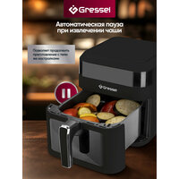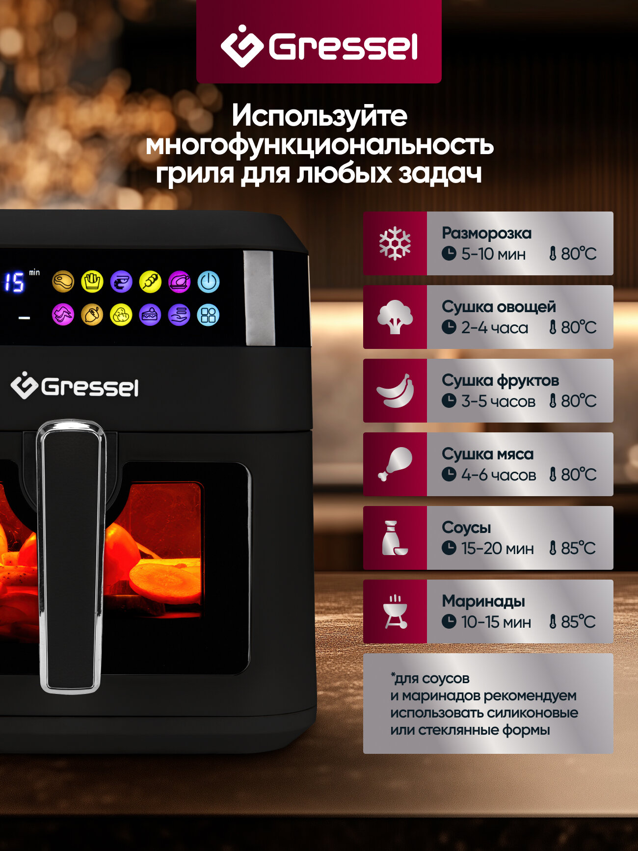 Gressel GAF-1822 не ограничивается лишь жаркой и запеканием. Функции разморозки, сушки овощей, фруктов и мяса, а также приготовление соусов и маринадов делают этот аэрогриль универсальным помощником на кухне. Если нужно быстро размягчить остатки пищи перед мытьём чаши, используйте функцию предварительной мойки: налейте 300–500 мл воды, установите температуру 100° и запустите процесс на 10–15 минут — благодаря пару и горячей воде загрязнения отойдут намного легче. При извлечении чаши во время готовки срабатывает автоматическая пауза, позволяя возобновить процесс с прежними настройками сразу после возвращения чаши на место.