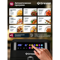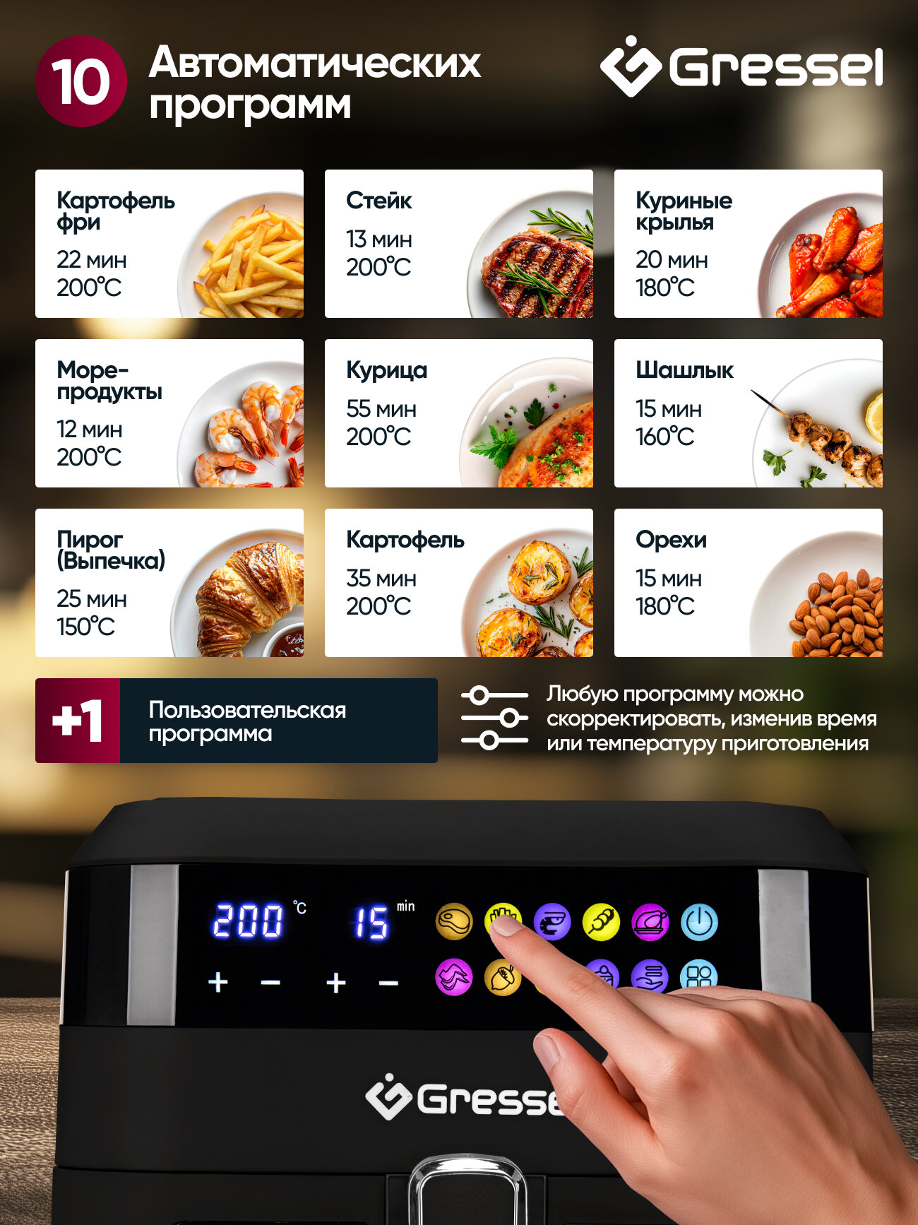 Аэрогриль Gressel GAF-1822 — идеальное решение для тех, кто стремится разнообразить свой рацион и готовить полезные блюда без лишнего масла. Модель отличается лаконичным дизайном и вместительной чашей объёмом 6 литров, что позволяет без труда готовить как небольшие порции, так и полноценные блюда для всей семьи. Мощность 1500 Вт обеспечивает быстрый и равномерный нагрев, а сенсорный дисплей с 10 автоматическими программами упрощает выбор оптимального режима. Кроме привычных пресетов для стейков, картофеля фри, курицы или морепродуктов, в приборе предусмотрена дополнительная пользовательская программа, которую можно настраивать самостоятельно, подбирая время и температуру в диапазоне от 80° до 200°.